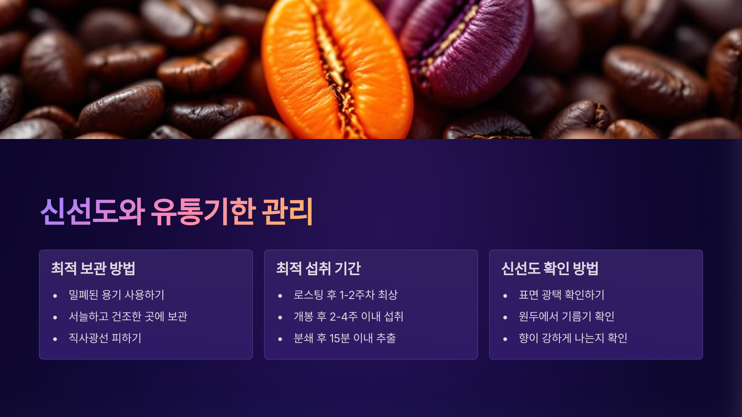 커피는 식품이에요. 아무리 좋은 원두라도 신선하지 않으면 제맛을 느낄 수 없어요. 그래서 유통기한보다는 '로스팅 날짜'가 중요해요! 특히 갓 볶은 원두는 향이 강하고 맛이 풍부하죠.