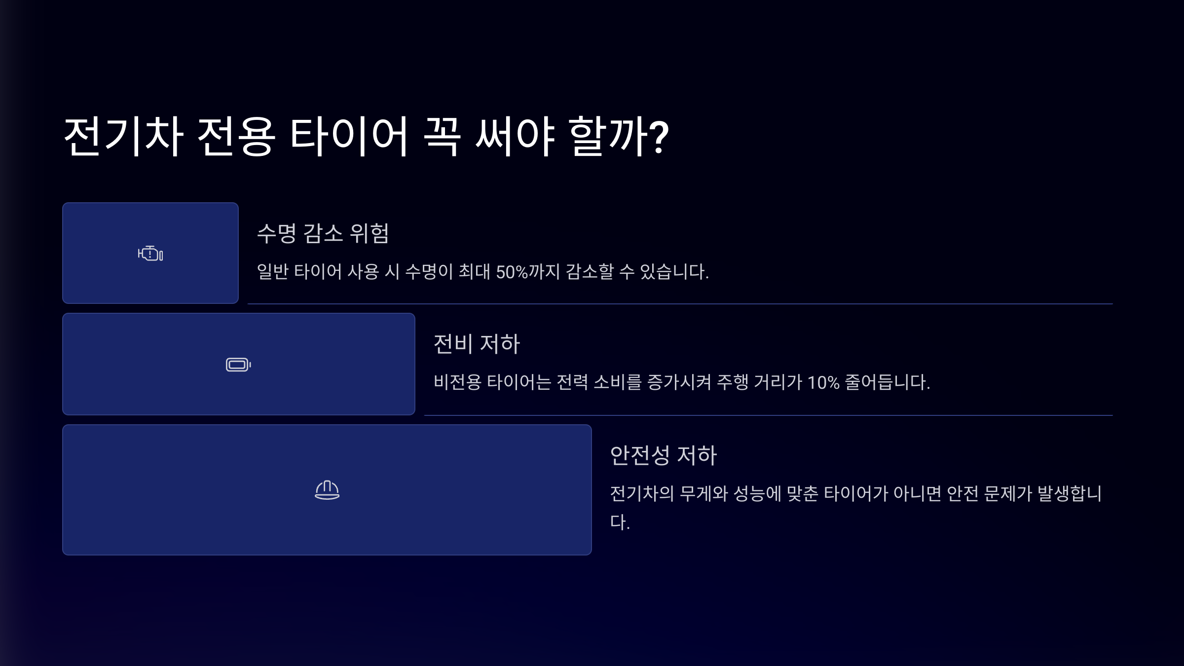 - ⚡ **연비(전비) 저하** – 구름 저항이 높은 타이어를 사용하면 주행거리가 줄어들어요.