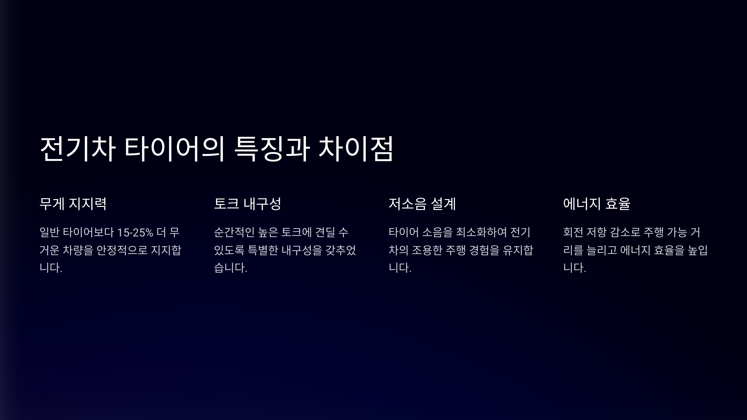 ✔ **강한 토크에 대응하는 내구성** 전기차는 출발과 동시에 최대 토크가 발생해요. 일반 타이어를 사용하면 빠르게 마모되거나 접지력이 부족할 수 있어요.