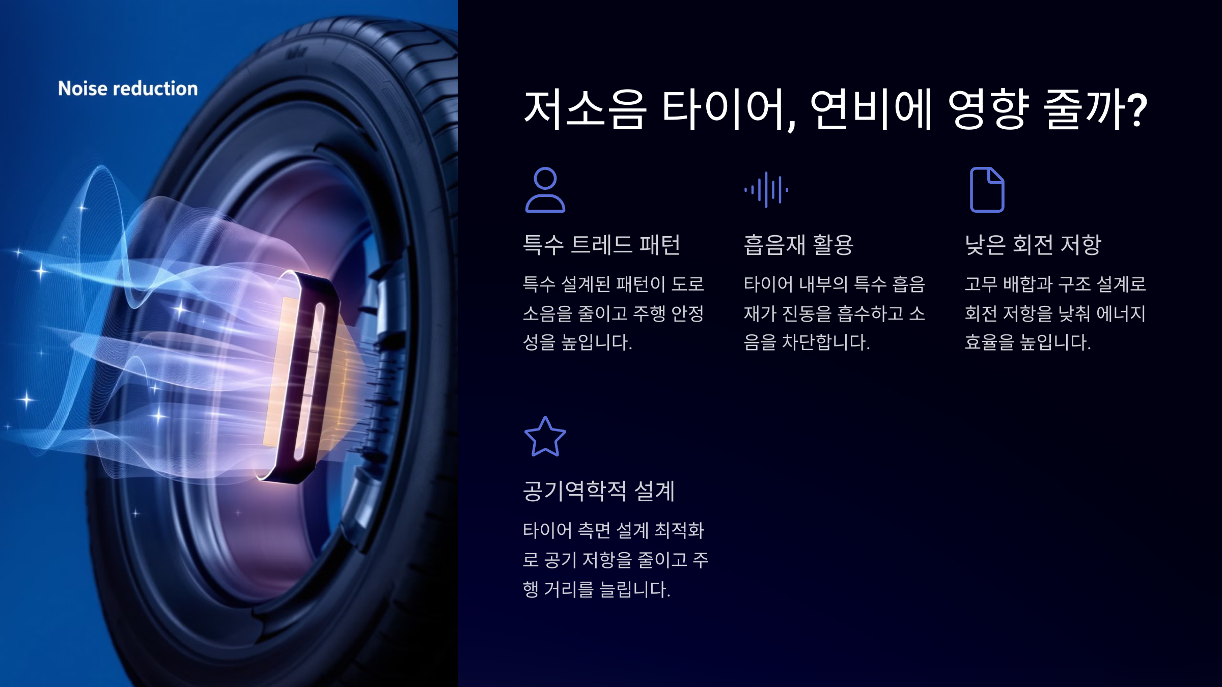 🌟 **1. 저소음 타이어는 어떻게 작동할까?** 저소음 타이어는 **특수한 트레드 패턴, 흡음재 삽입, 연질 고무 소재** 등을 활용해 노면 소음을 줄여요. 전기차는 엔진 소음이 없어서 도로와의 마찰음이 더 잘 들리는데, 이를 최소화하기 위해 소음 저감 기술이 적용돼요.