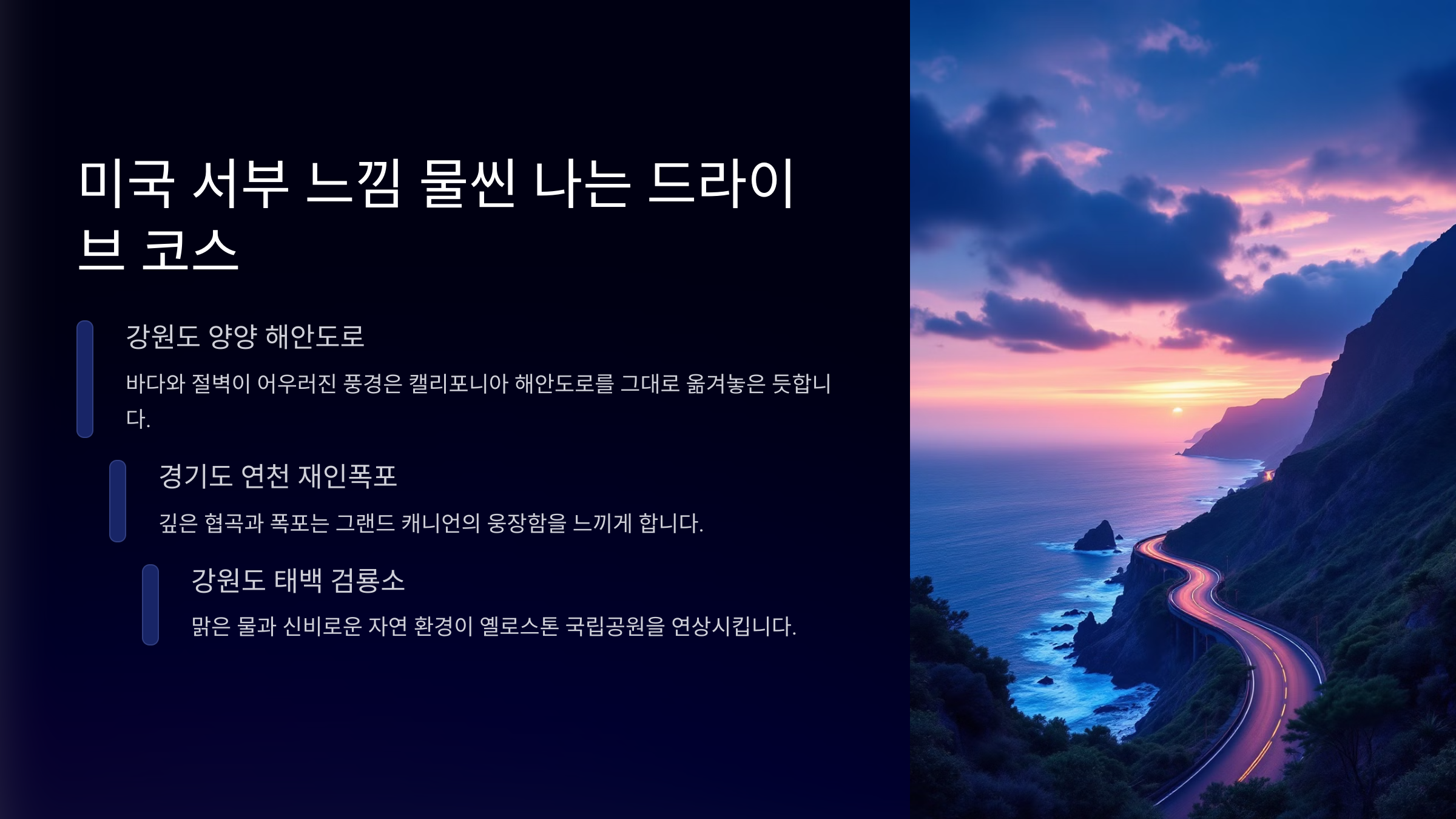 🔹 강원도 정동진 해안도로 – 캘리포니아의 ‘퍼시픽 코스트 하이웨이’를 떠올리게 하는 곳이에요. 드넓은 바다를 따라 달리는 시원한 해안 도로에서 완벽한 드라이브를 즐겨보세요. 🌊