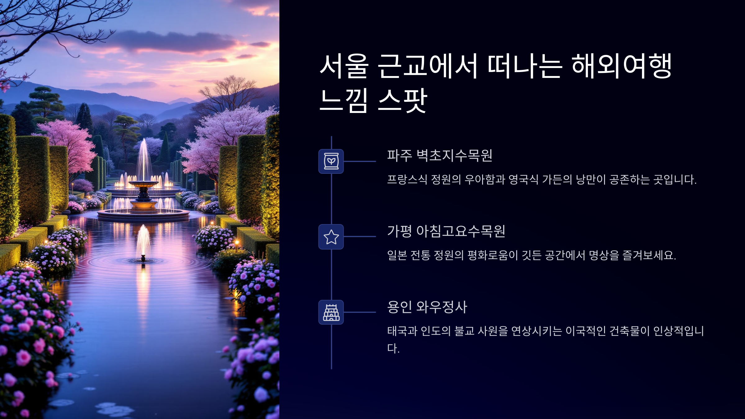 서울 근교에서 가볍게 떠날 수 있는 해외 감성 여행지, 어떤 곳이 가장 가보고 싶나요? 🏡 주말을 이용해 색다른 분위기를 느껴보세요! 🎡