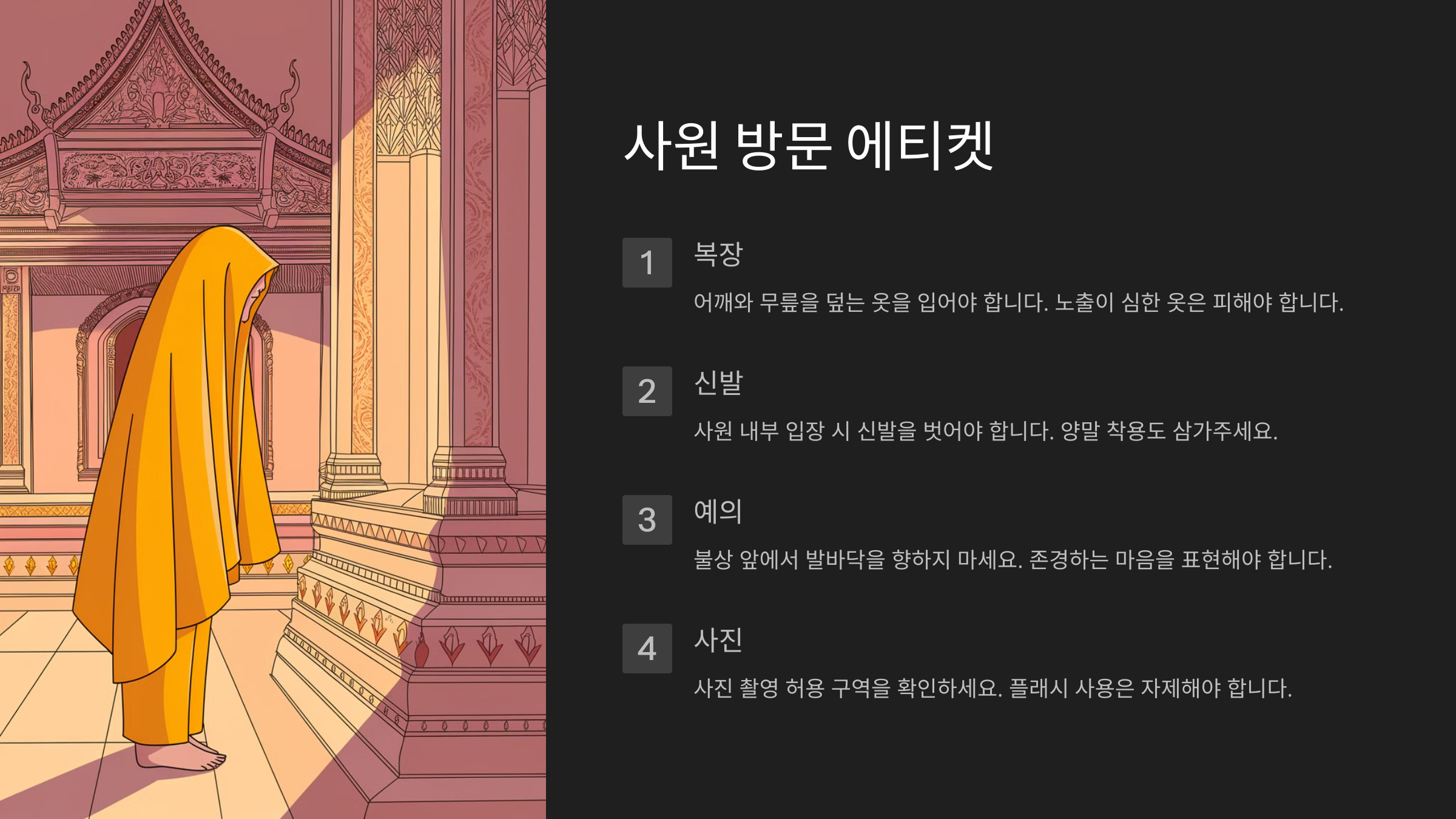 📌 다음으로 사원 방문 시 지켜야 할 드레스코드 & 에티켓을 알아볼게요!