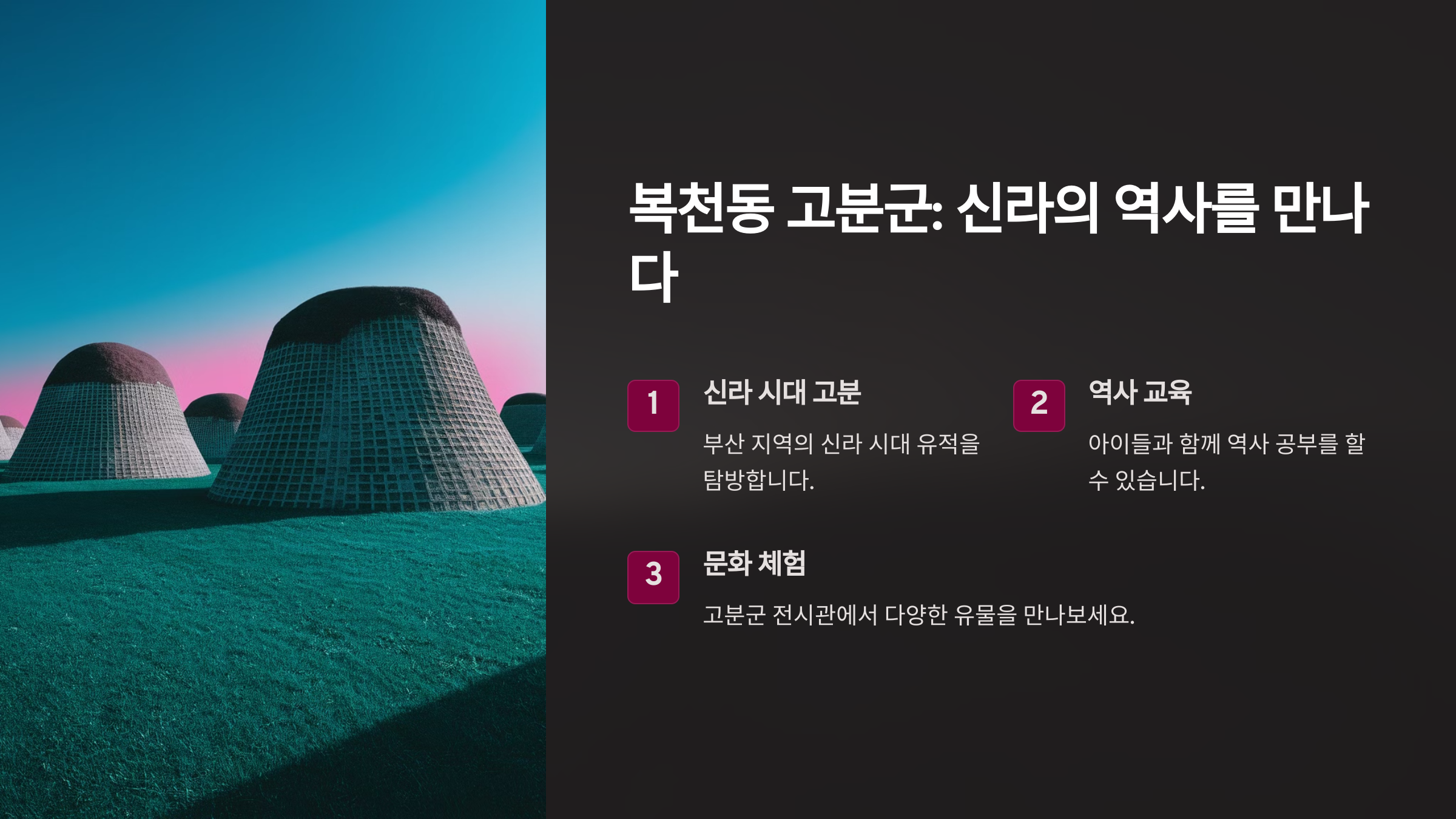 복천동 고분군은 부산의 오래된 역사를 체험할 수 있는 특별한 장소예요. 가야와 신라 시대의 흔적을 따라 걸으며 부산의 옛 정취를 느껴보세요! 🏯