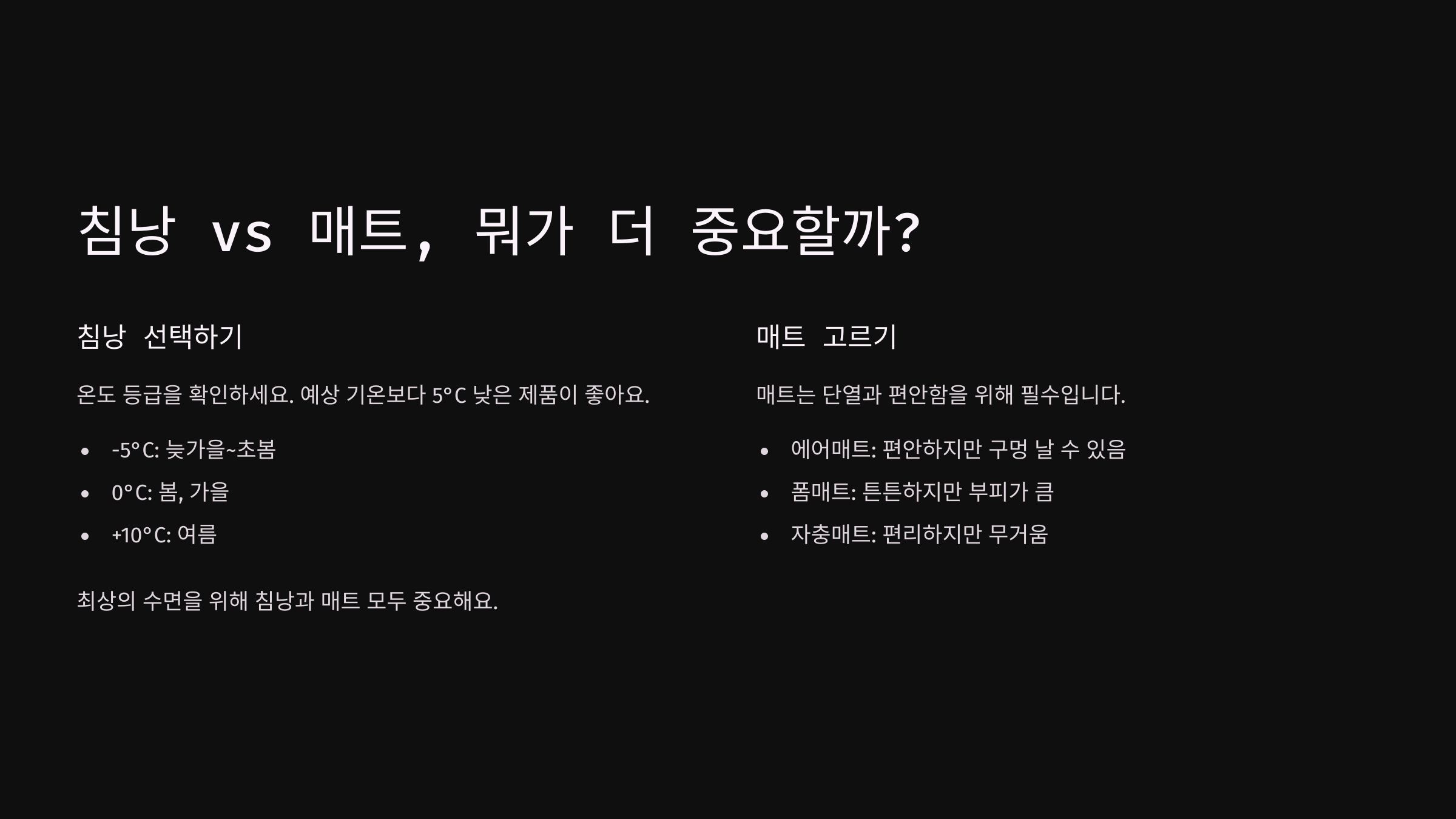 | 매트 | 편안한 숙면 제공, 바닥 냉기 차단 | 보온 기능이 부족함 |
