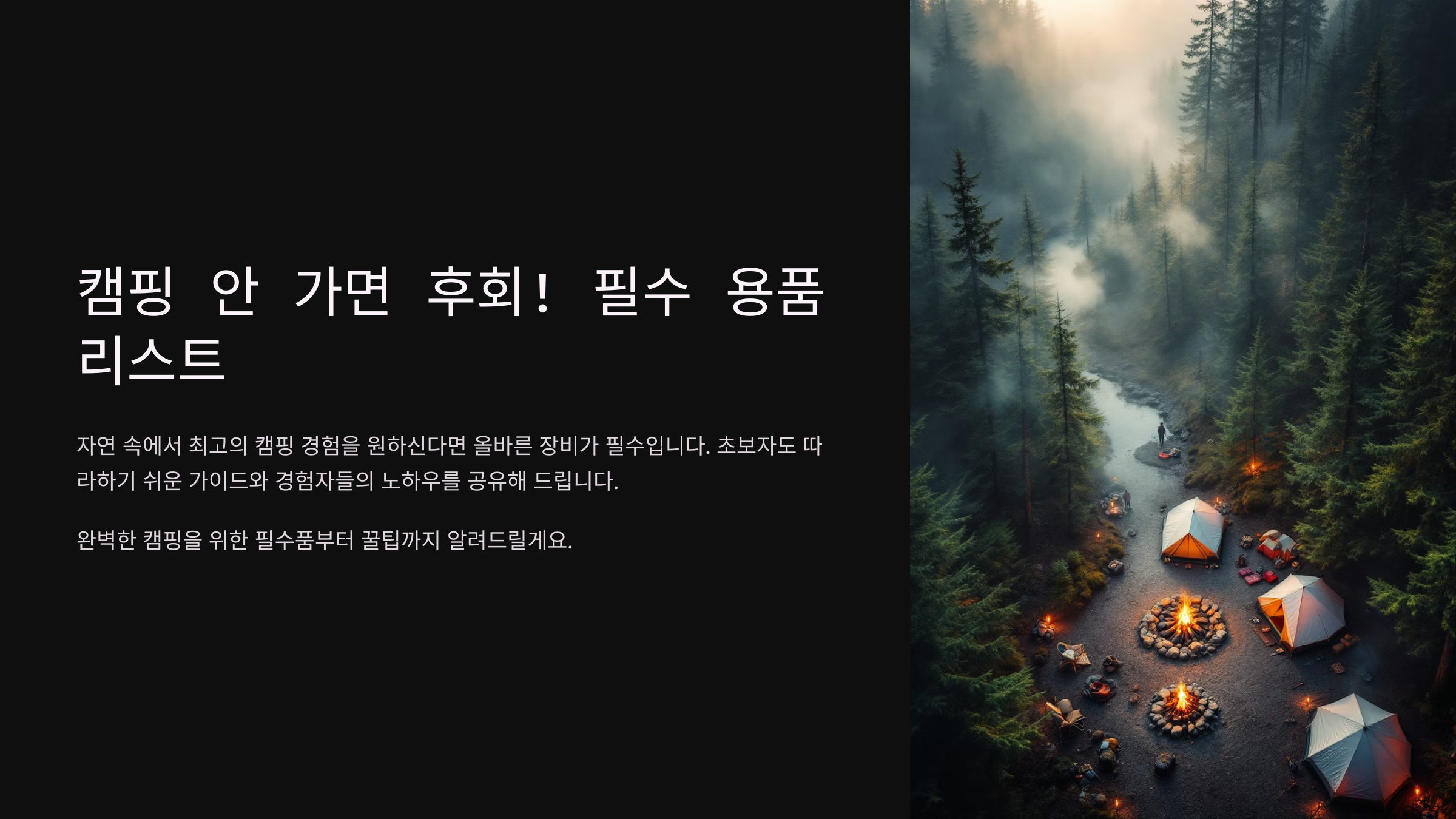 텐트부터 주방용품, 방수 용품까지 꼼꼼하게 체크하고 떠나면 편안하고 안전한 캠핑을 즐길 수 있어요. 한 번 빠져들면 헤어나올 수 없는 캠핑의 매력, 제대로 준비해서 만끽해 보자고요! 🌲🔥