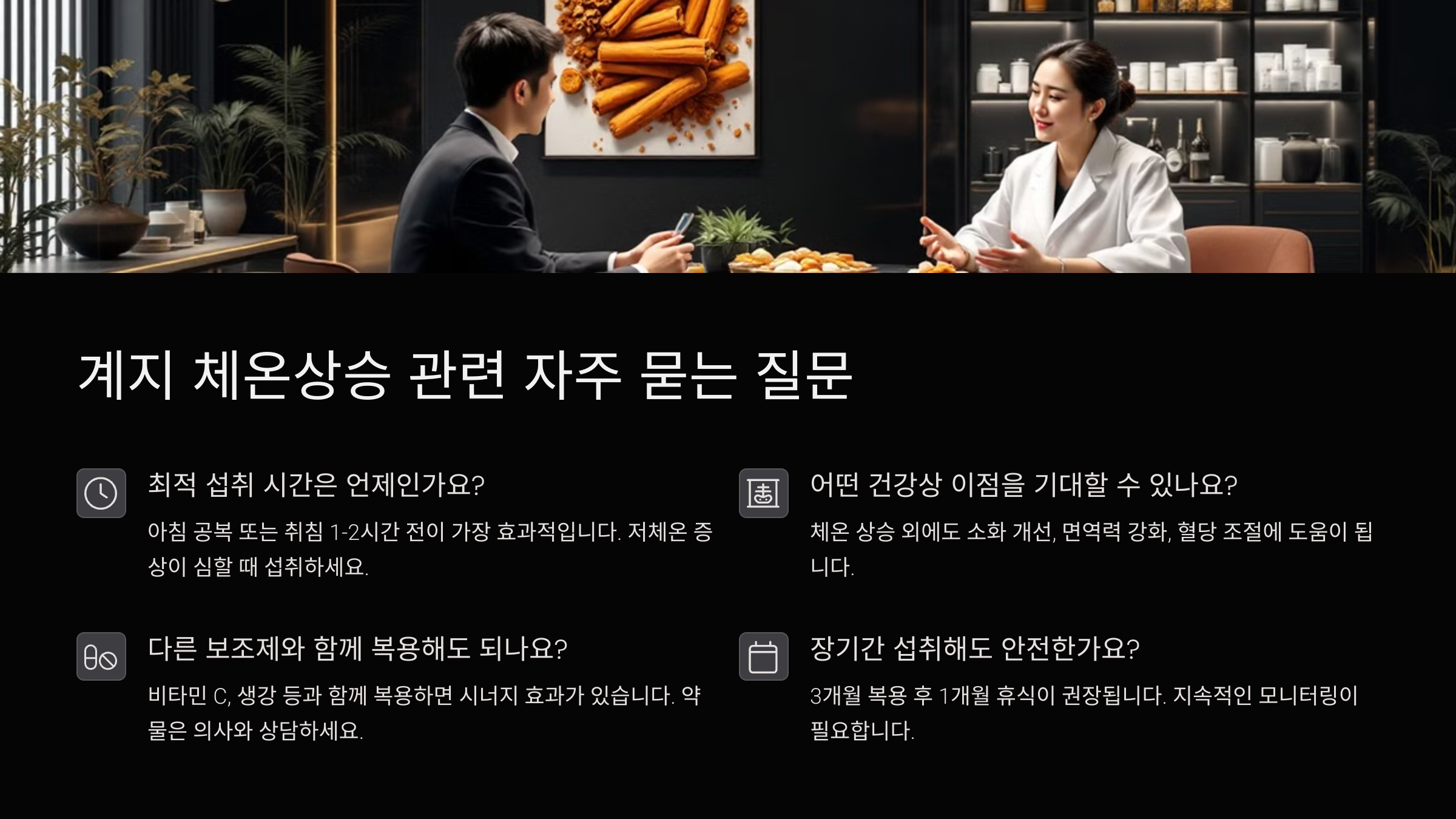 A2. 빠르면 복용 후 30분 이내에도 따뜻함을 느낄 수 있어요. 하지만 체온 유지에는 지속적인 복용과 생활 습관 개선이 함께 필요해요.