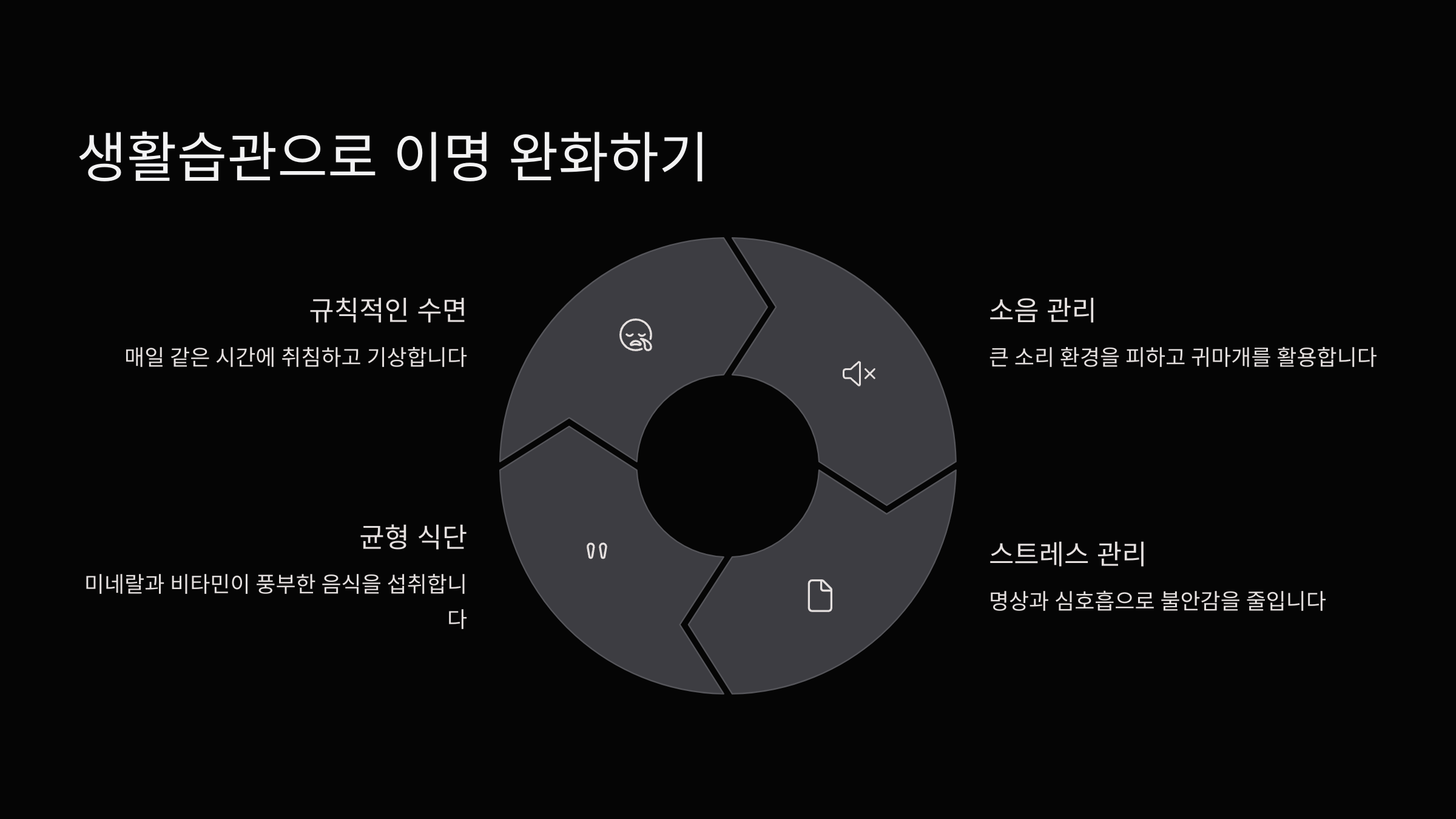이명은 완치를 목표로 하기보다는 ‘관리’에 중점을 두는 게 좋아요. 일상 속에서 꾸준히 좋은 습관을 유지하면 증상이 상당히 가벼워질 수 있답니다. 특히 건강한 수면, 스트레스 관리, 규칙적인 식사, 운동은 이명 완화에 큰 도움이 돼요.