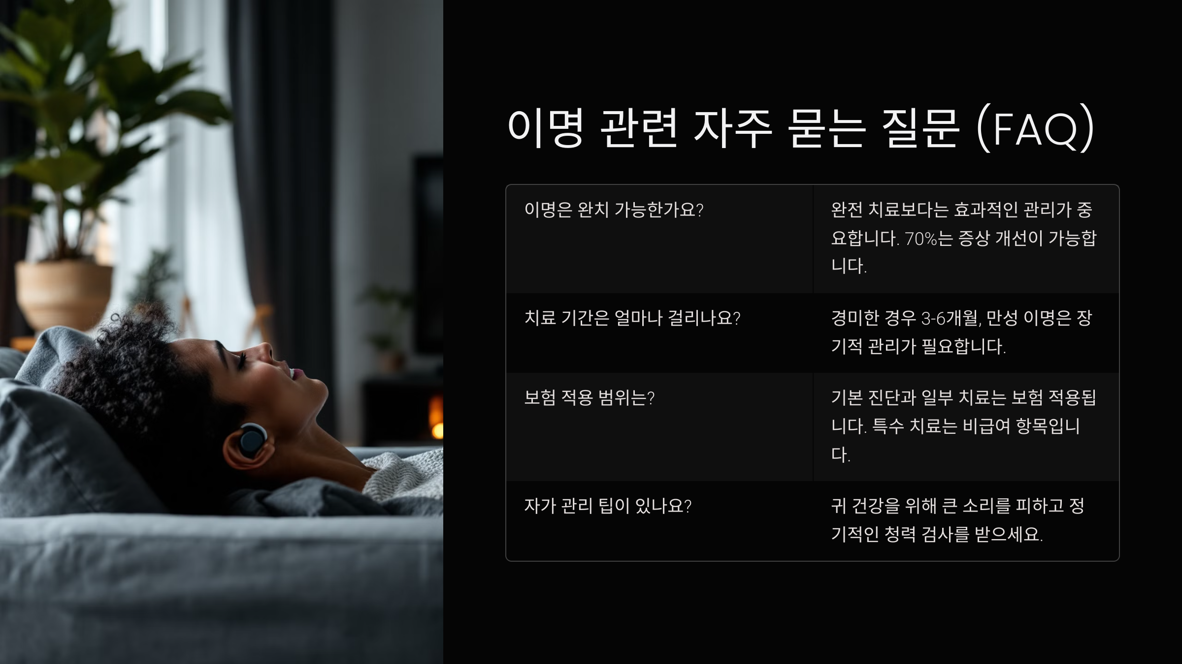 이명은 나만 겪는 게 아니에요. 수많은 사람들이 비슷한 증상으로 고생하고 있고, 실제로 증상을 극복하거나 조절하며 잘 지내는 사례도 많아요. 그래서 너무 절망하거나 ‘왜 나만 이럴까’ 생각하지 않았으면 해요. 충분히 관리 가능한 증상이에요.