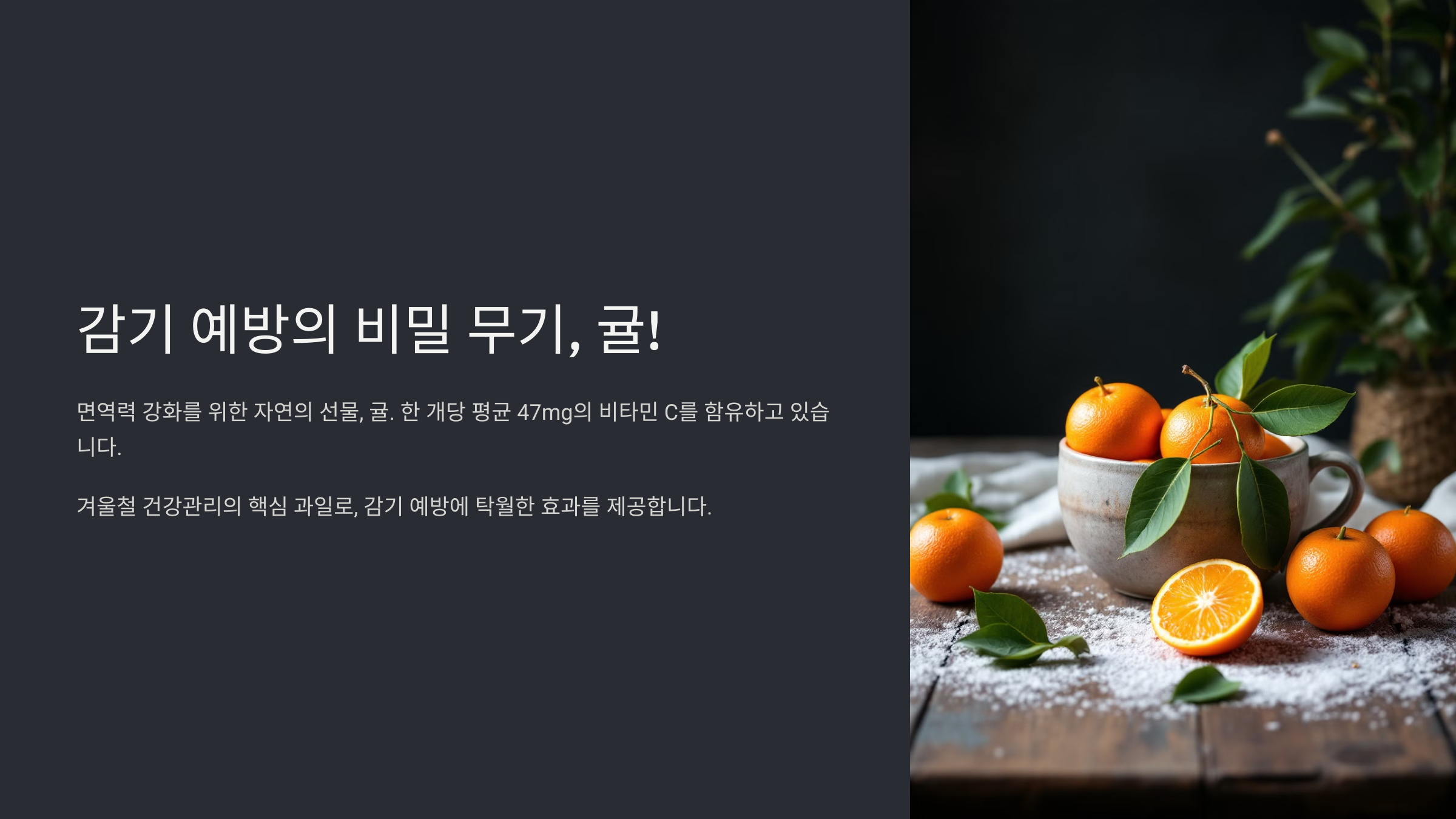 귤을 그냥 무심코 먹기보단, 언제 먹느냐를 조금만 신경 써보세요. 같은 귤이라도 효과는 두 배로 늘어나고, 감기 예방력도 훨씬 높아질 거예요!🍊💪