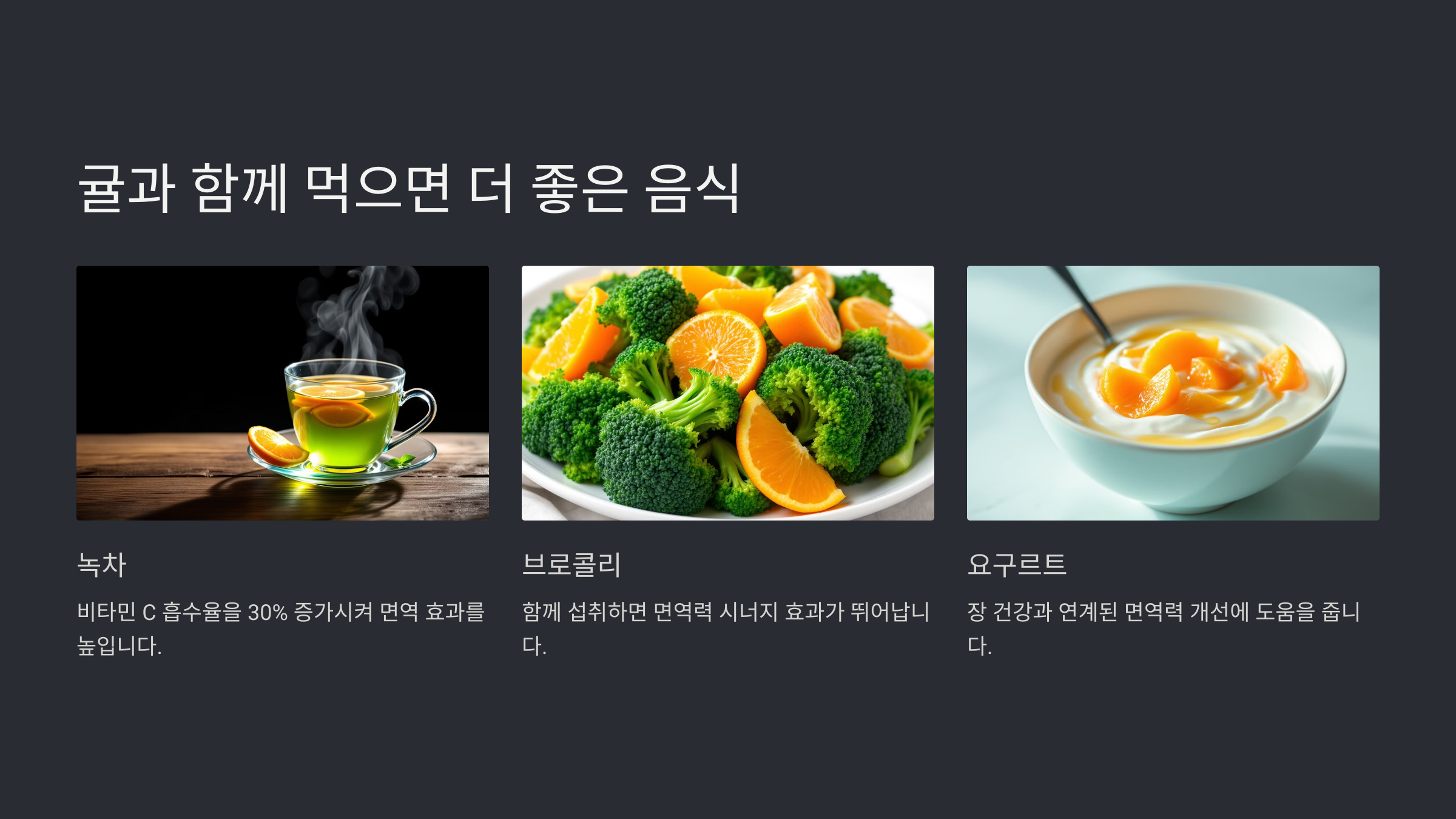 귤 하나만으로도 충분히 맛있고 건강하지만, 함께 먹으면 더 좋은 음식들이 있어요! 이 조합들을 기억해두면 감기 예방은 물론이고 소화, 피부 건강, 피로 회복까지 챙길 수 있답니다.