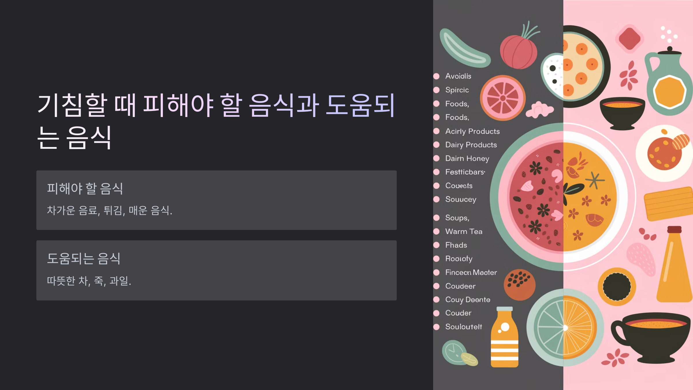 다음으로, 기침이 심할 때 피해야 할 음식과 기침 완화에 도움이 되는 음식을 알아볼게요! 🍽️