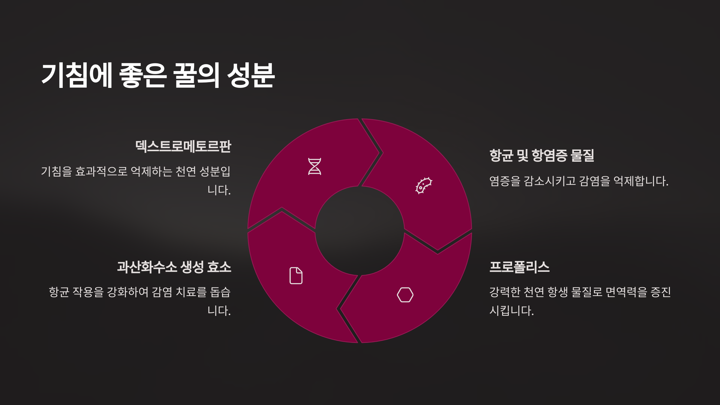 기침 때문에 잠 못 이루는 밤, 따뜻한 물에 꿀 한 스푼을 타 마시면 확실히 숨통이 트이는 느낌이 들죠. 그렇다면 정말 기침에 효과적인 '꿀'은 어떤 종류일까요? 꿀이라고 다 같은 게 아니고, 기침에 더 특화된 종류도 존재해요.