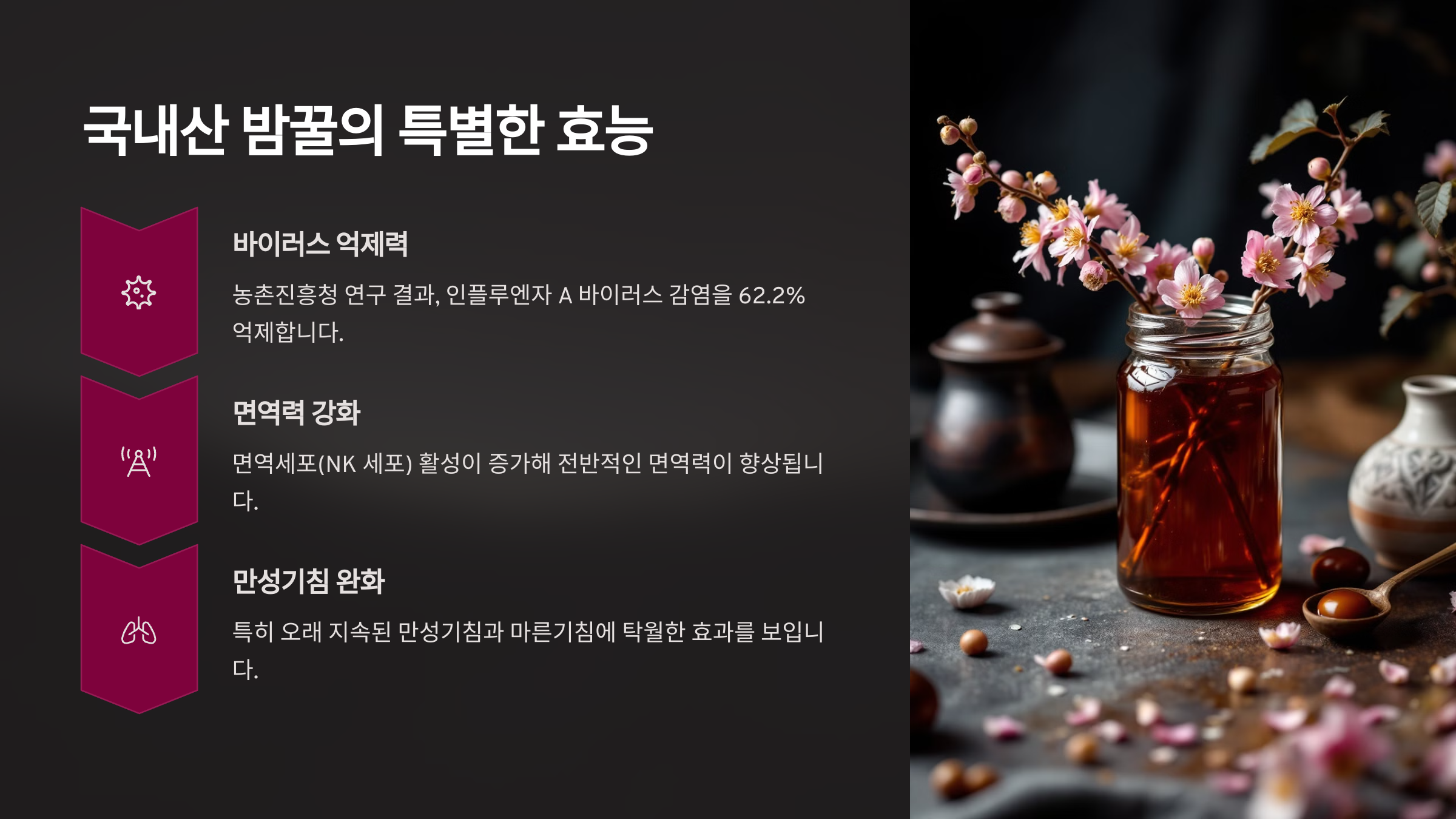 대표적인 국내산 기침 꿀로는 '밤꿀', '야생화꿀', 그리고 '아까시꿀(아카시아)'이 있어요. 밤꿀은 앞서 언급한 것처럼 항산화 능력이 뛰어나 기관지에 직접적으로 작용해주는 꿀이에요. 약간 쌉쌀한 맛 덕분에 약처럼 느껴질 정도예요.