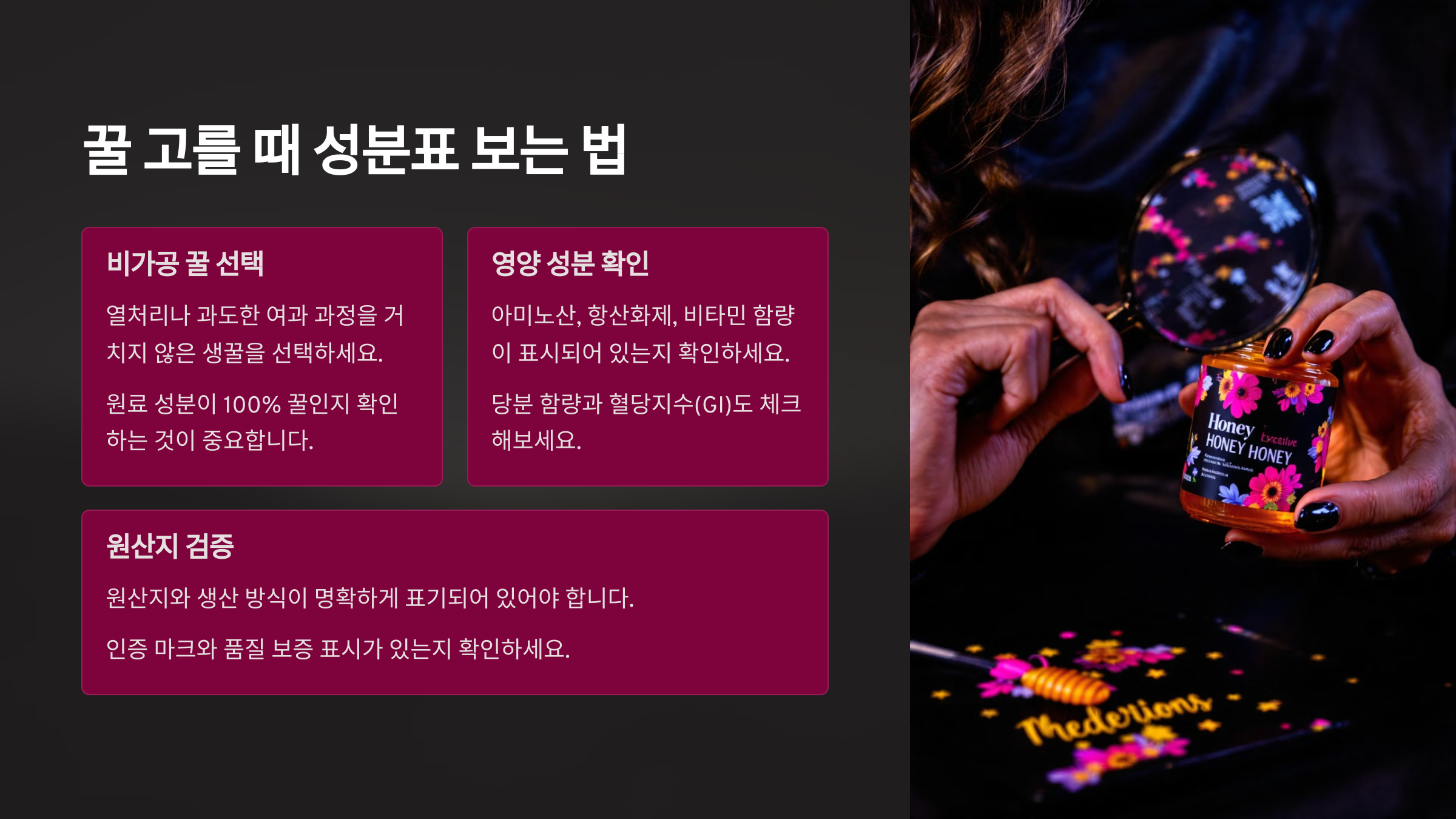 꿀을 살 때 “천연꿀 100%”라고만 적혀 있으면 믿고 사도 될까요? 실제로 성분표와 라벨을 꼼꼼히 보면 함정이 꽤 많아요. 특히 기침 완화를 목적으로 꿀을 고를 땐 어떤 성분이 들어있는지, 어떻게 가공됐는지 꼭 살펴봐야 해요.