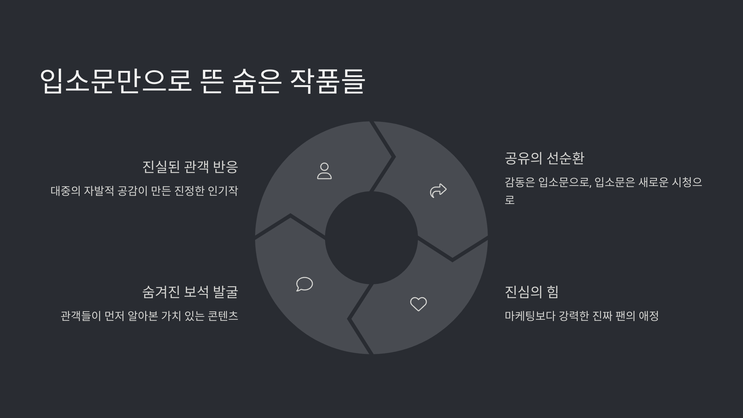 넷플릭스 알고리즘이 잘 잡아내지 못해도, 커뮤니티나 SNS를 통해 갑자기 뜨는 작품들이 있어요. 이런 작품들은 마케팅 없이 진짜 재미 하나로 입소문을 탄 경우라 더 믿을만하죠!