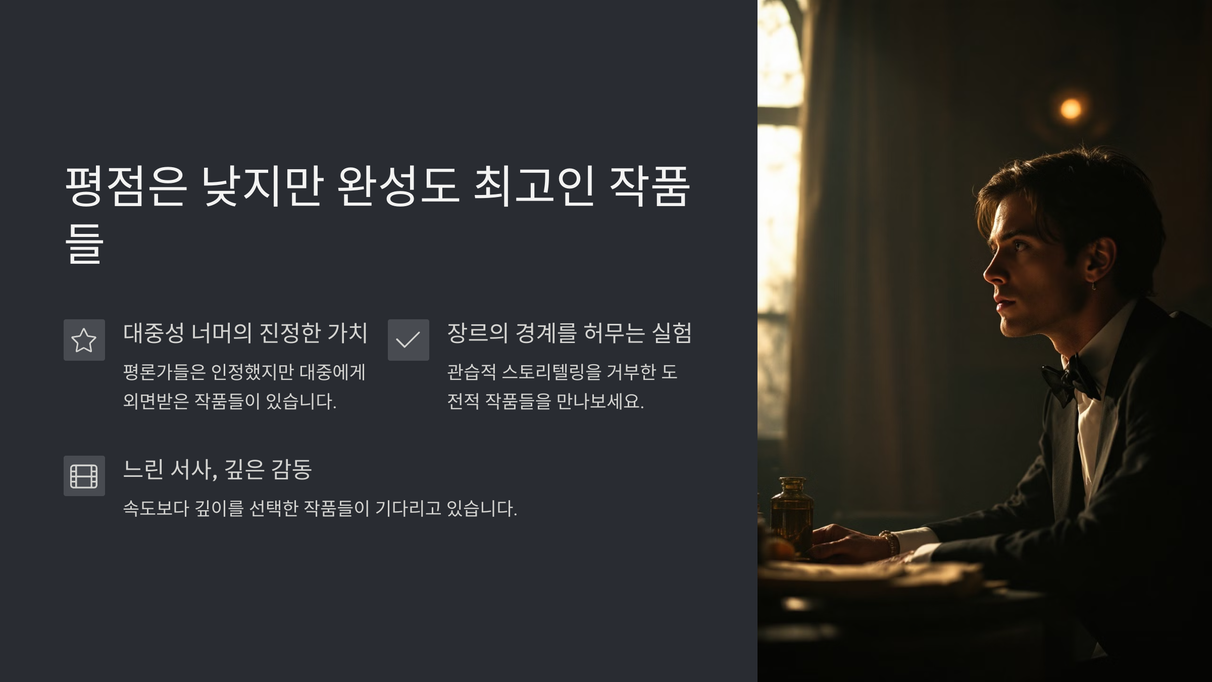 이런 작품들은 속도감보다는 깊이가 중심이에요. 한 편 한 편 곱씹어보면서 보는 걸 좋아하는 분이라면, 평론가들의 극찬 리스트에서 새로운 인생작을 꼭 찾을 수 있을 거예요 💡