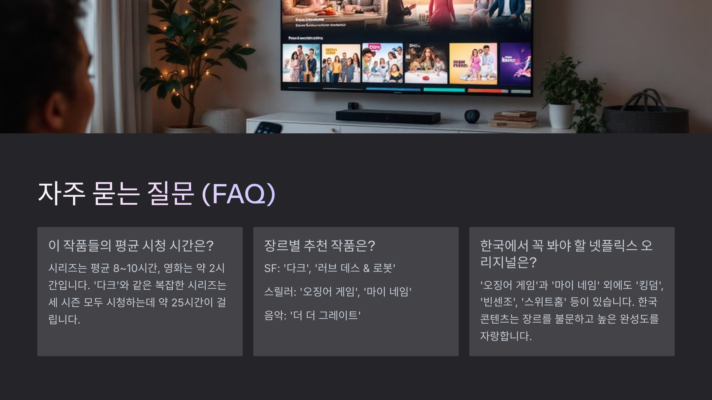 A7. 최근 넷플릭스는 미니시리즈 형태로 4~8부작 콘텐츠도 많아서 부담 없이 보기 좋아요.