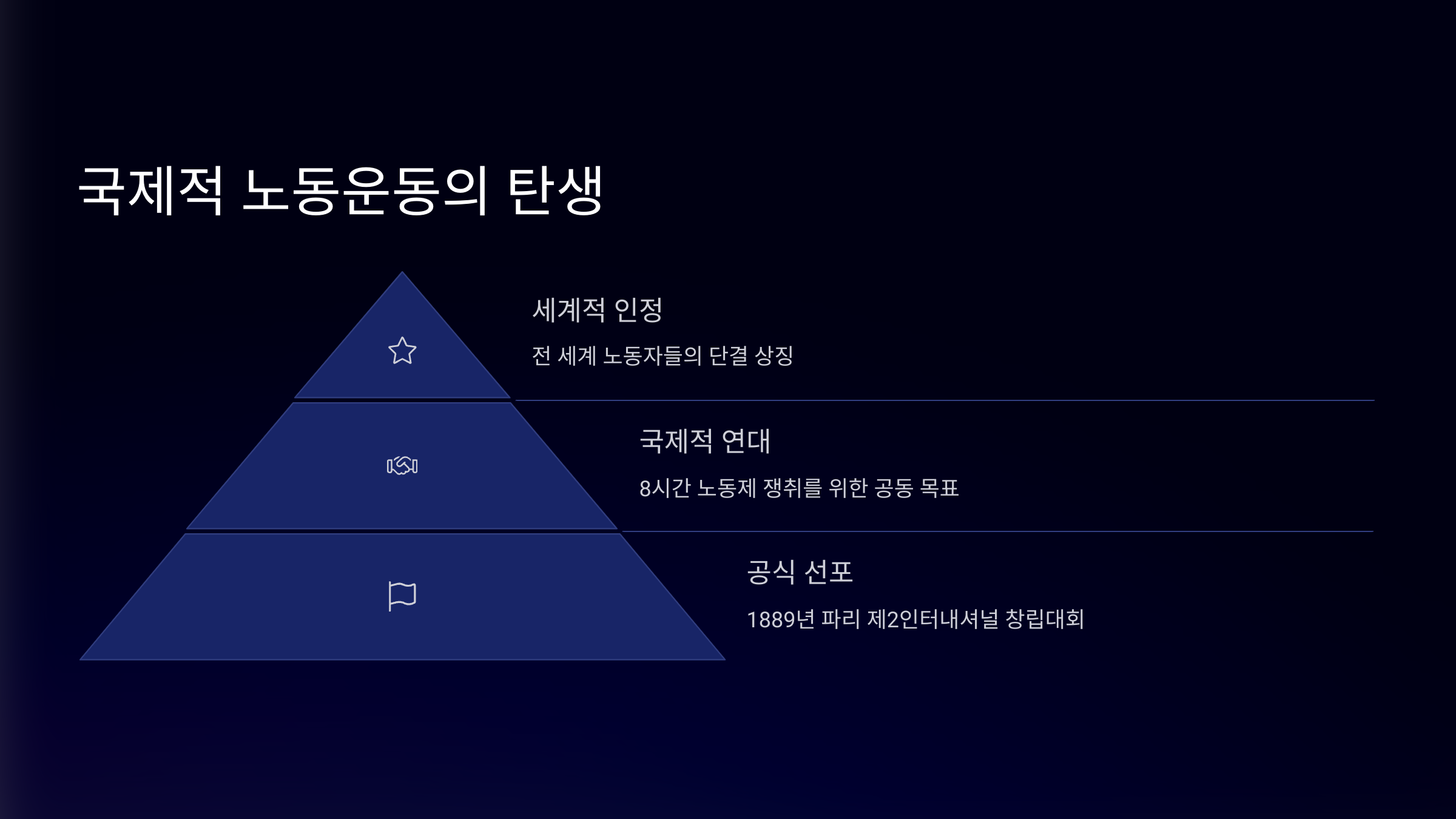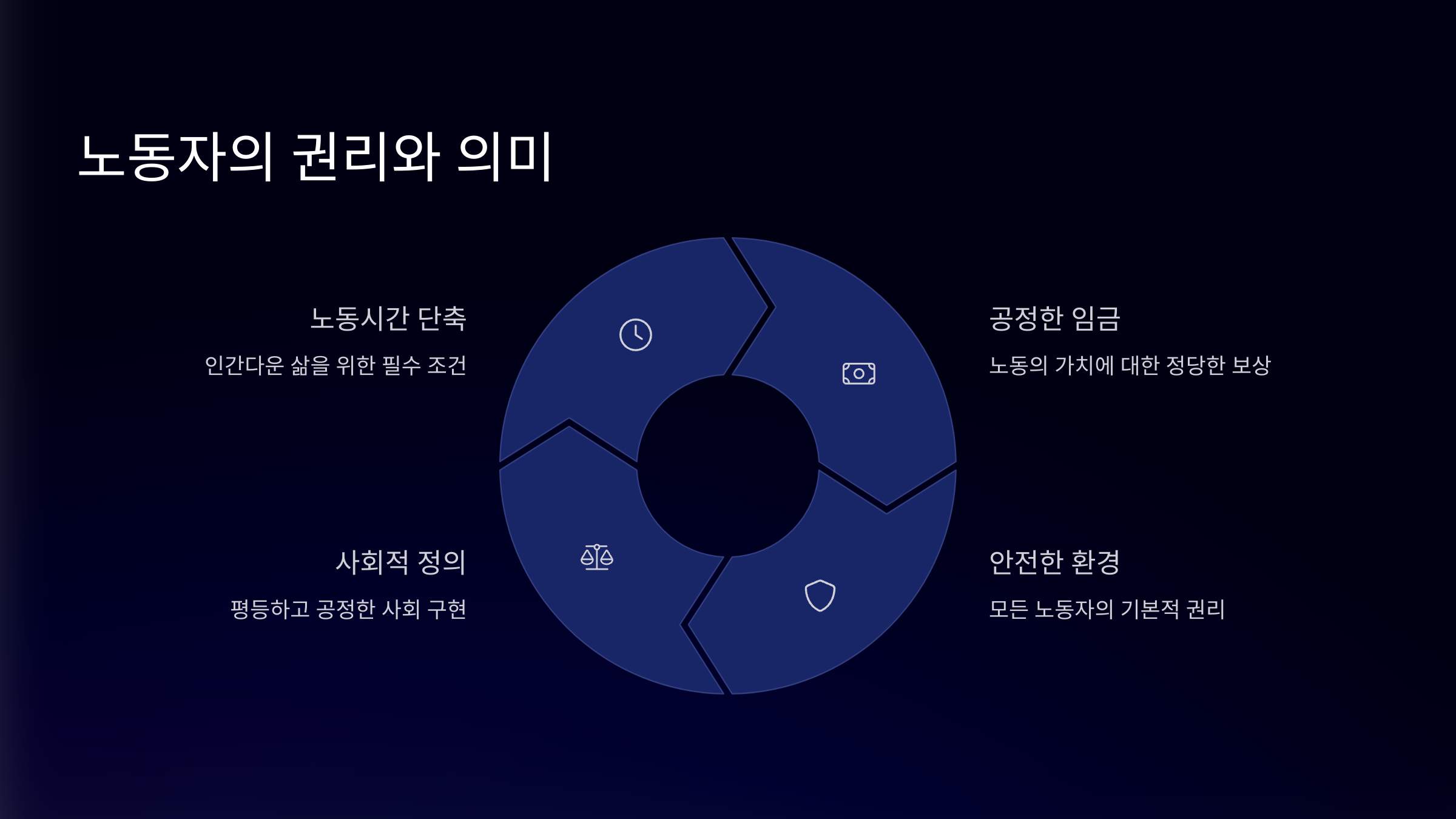 | 8시간 노동 | 하루 8시간 일, 8시간 휴식, 8시간 자유 시간 보장 |