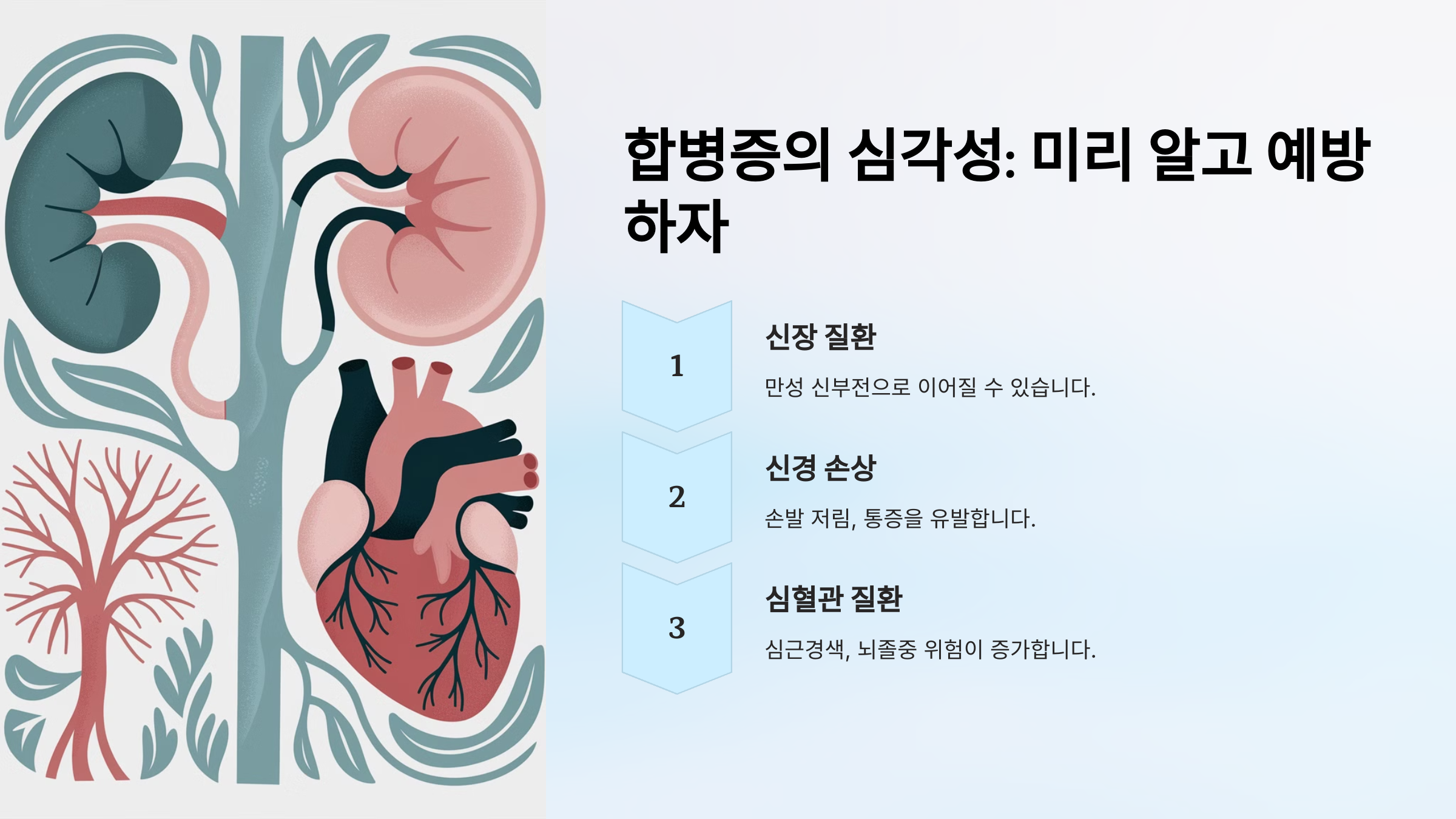 이처럼 당뇨 합병증은 조기에 관리하지 않으면 심각한 결과를 초래할 수 있어요. 혈당을 철저히 관리하는 것이 최선의 예방책이랍니다.