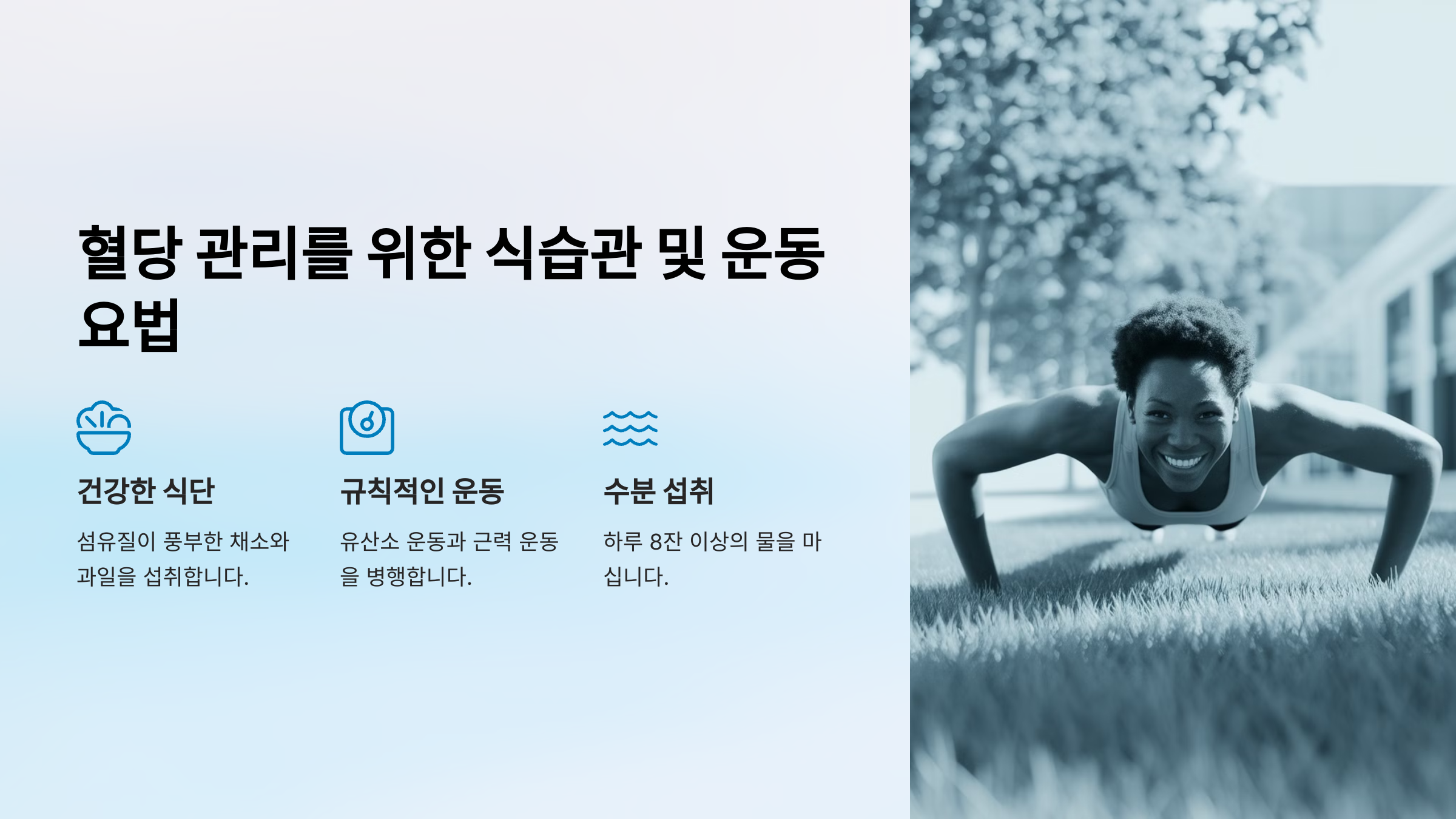 꾸준한 운동은 인슐린 감수성을 높이고 혈당을 낮추는 효과가 있어요. 하루 30분 이상 걷기, 근력 운동, 요가 등을 실천하는 것이 좋아요.