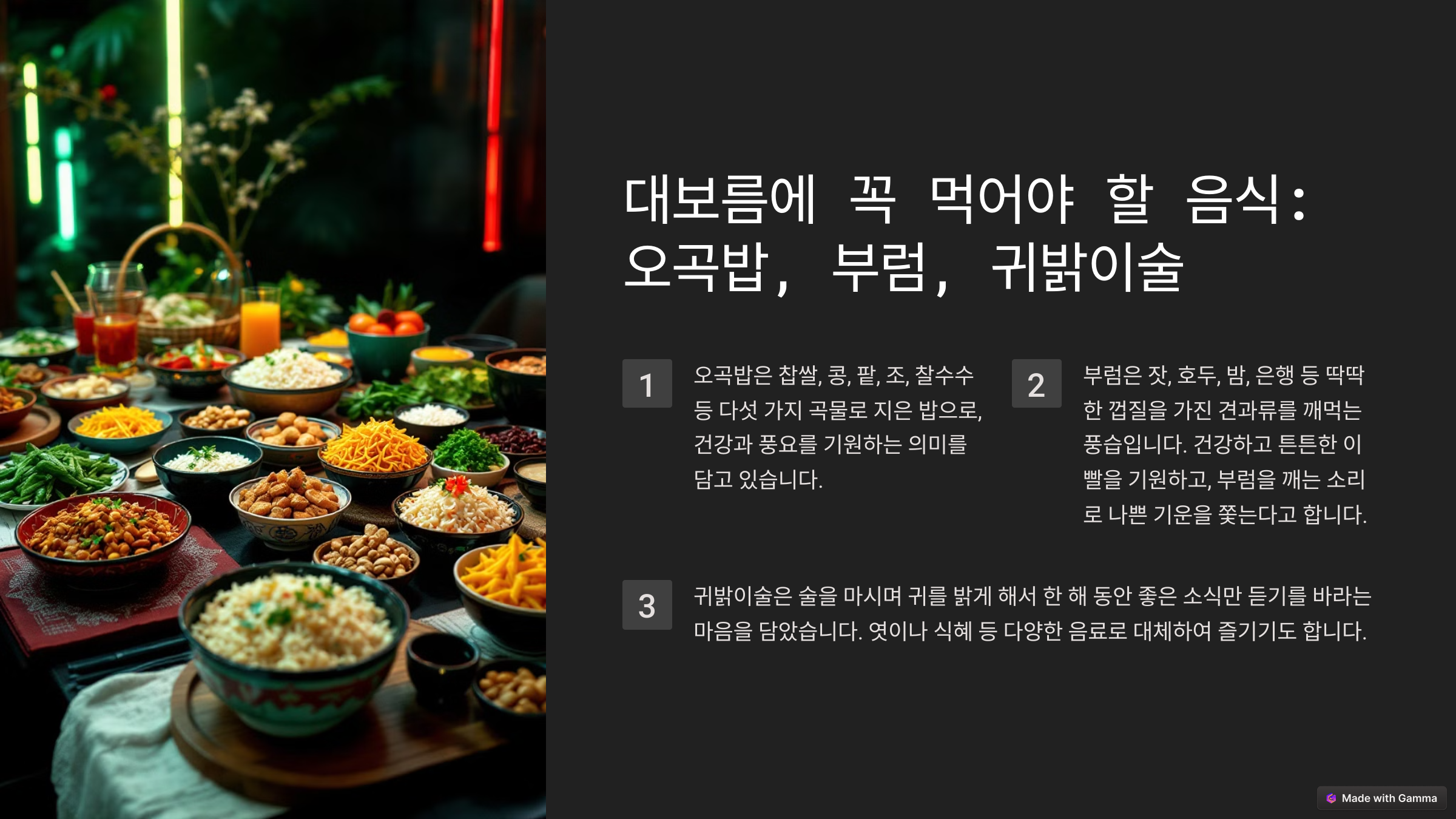 대보름에는 특별히 먹는 음식들이 있어요. 이 음식들은 단순한 먹거리가 아니라, 건강과 복을 기원하는 의미가 담겨 있답니다. 대표적으로 오곡밥, 부럼, 나물, 귀밝이술 등이 있어요.