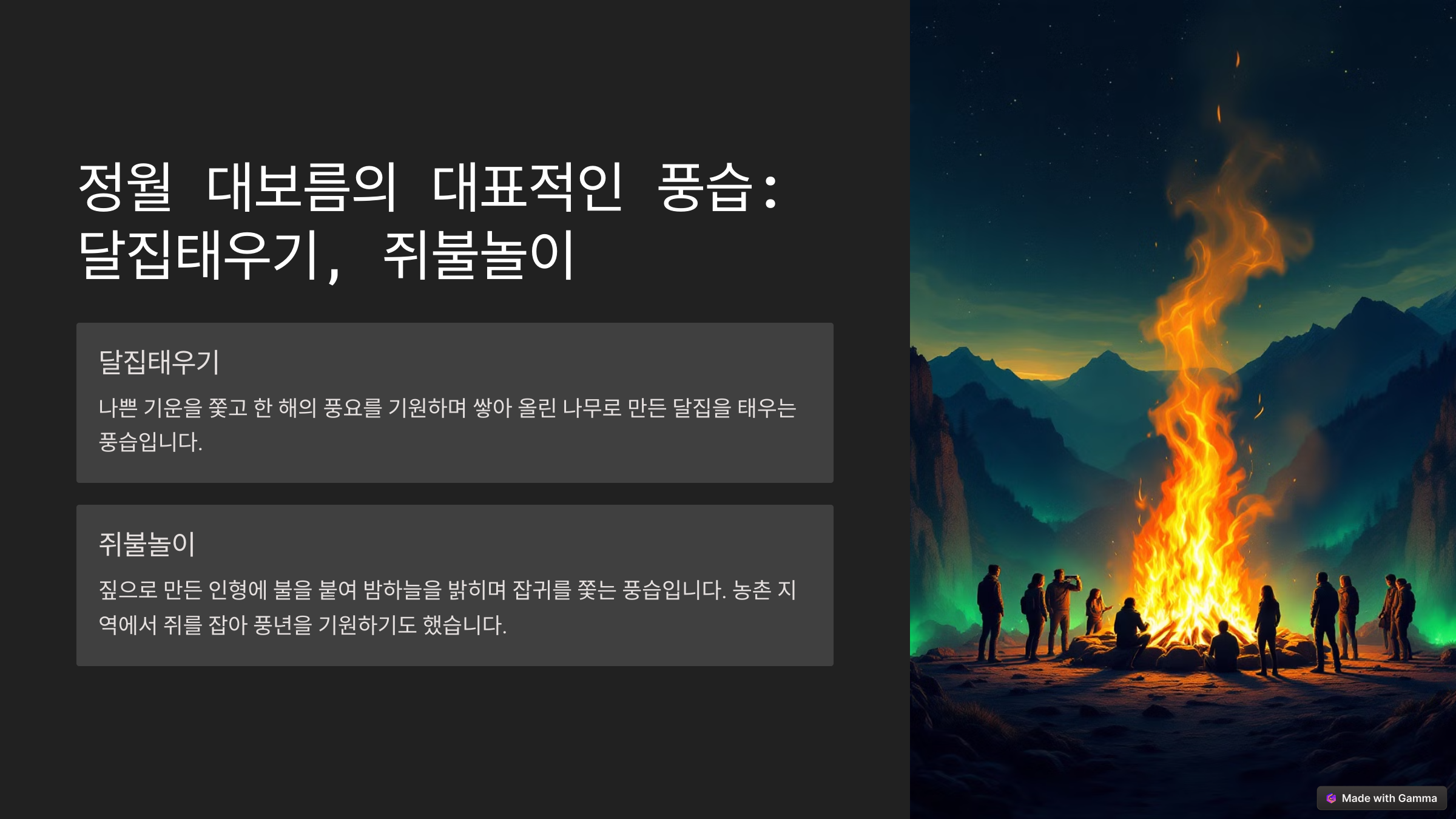 🔥 **쥐불놀이**: 논과 밭의 해충을 없애고 병해충 피해를 예방하기 위해 불을 놓는 풍습이에요. 아이들은 횃불을 들고 들판을 뛰어다니며 불을 피웠고, 이 불길이 해충을 없애는 역할을 했어요. 지금은 환경 문제로 일부 지역에서만 제한적으로 시행된답니다.
