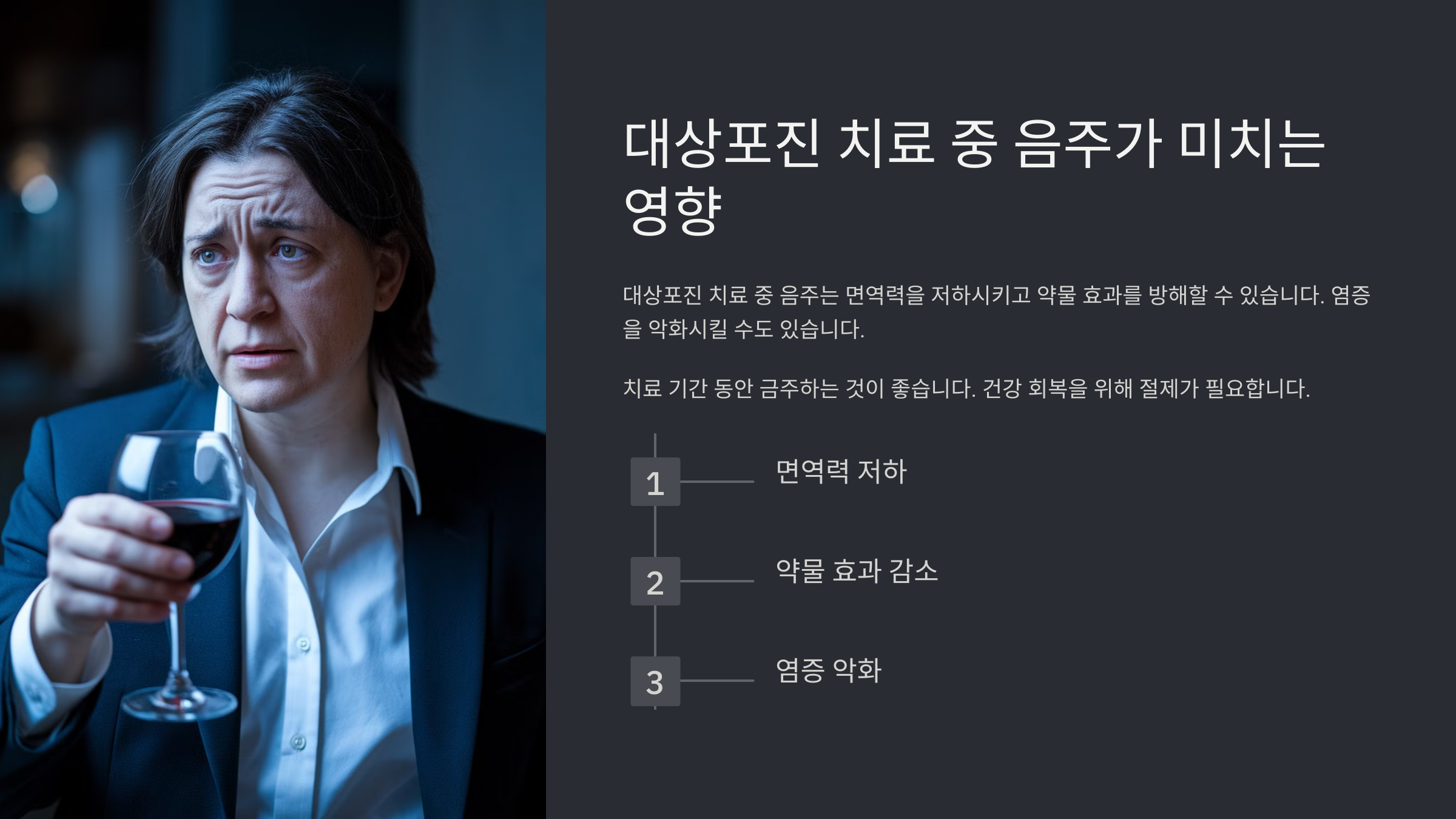✅ **면역력 저하** 음주는 **면역 체계를 약화**시켜 대상포진 회복을 늦출 수 있어요. 또한 **수면의 질을 떨어뜨려 피로가 누적**될 수 있어요.