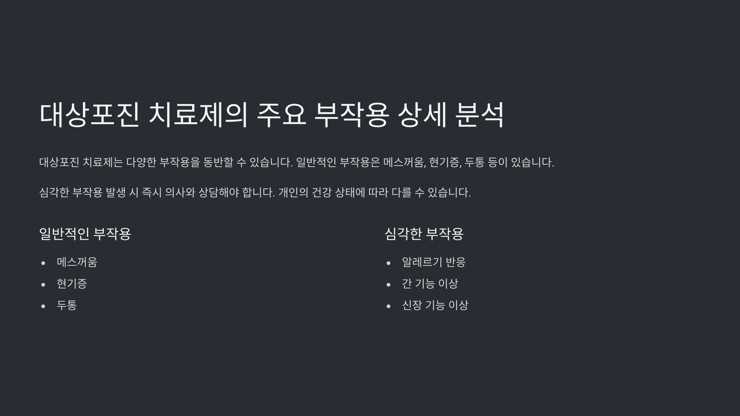 약물에 따라 부작용 정도가 다를 수 있어요. **복용 중 이상 증상이 나타나면 반드시 의사와 상담하세요!** 😊