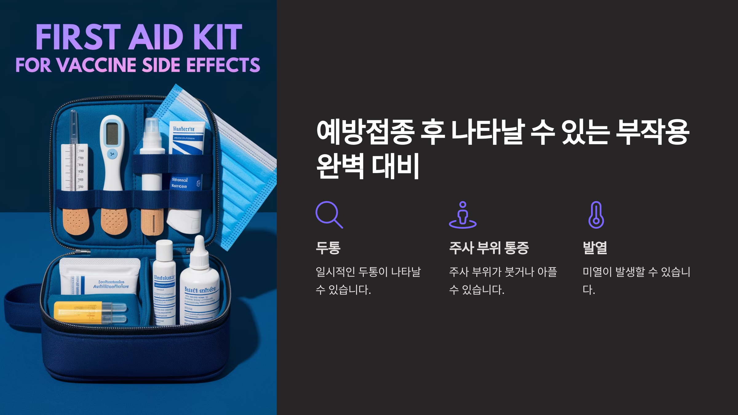대부분의 부작용은 **경미하고 2~3일 내에 사라지지만,** 만약 증상이 심해지거나 오래 지속된다면 병원을 방문하는 것이 좋아요. 백신을 맞기 전 건강 상태를 의사와 상담하는 것도 중요해요. 💉