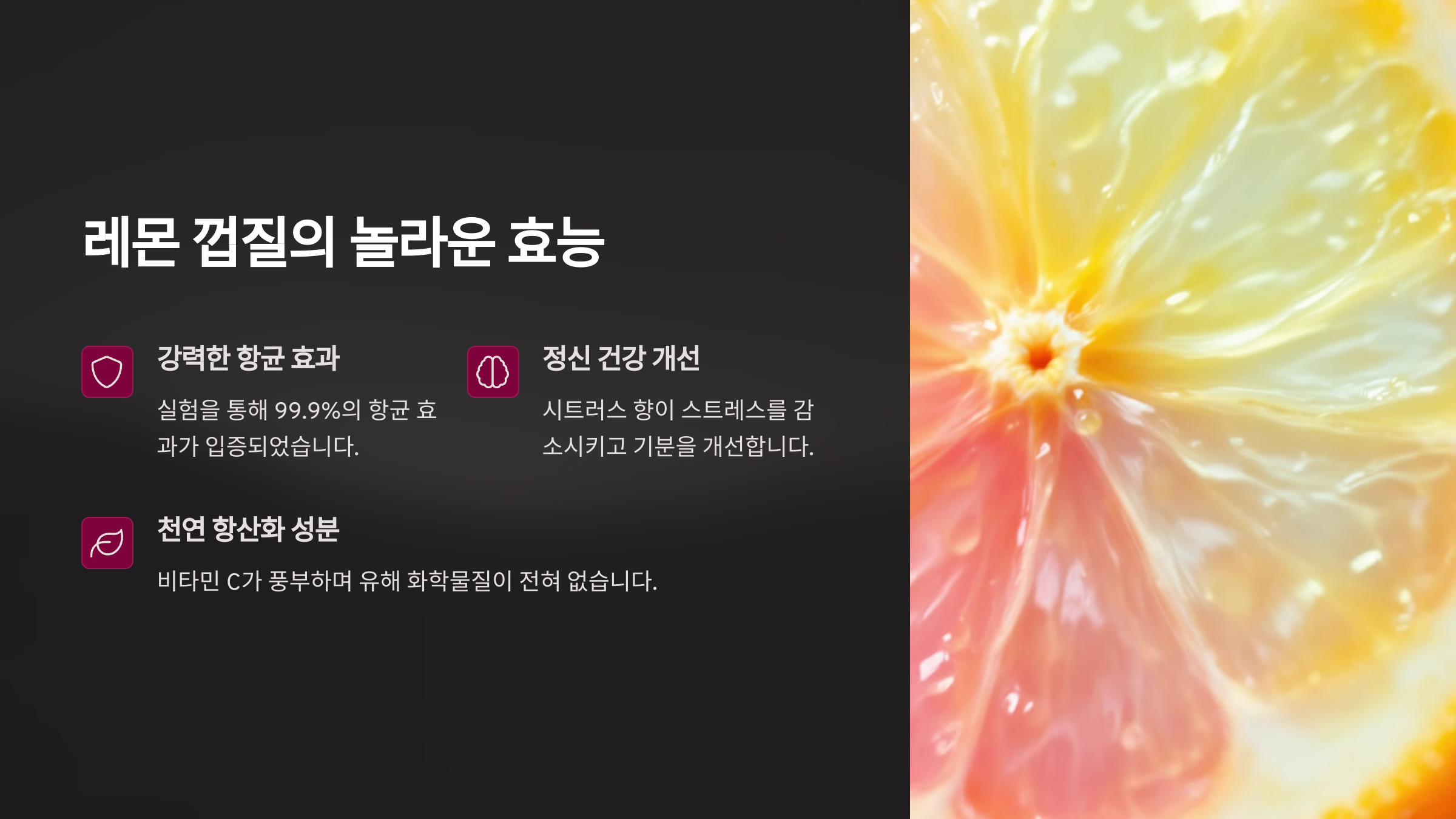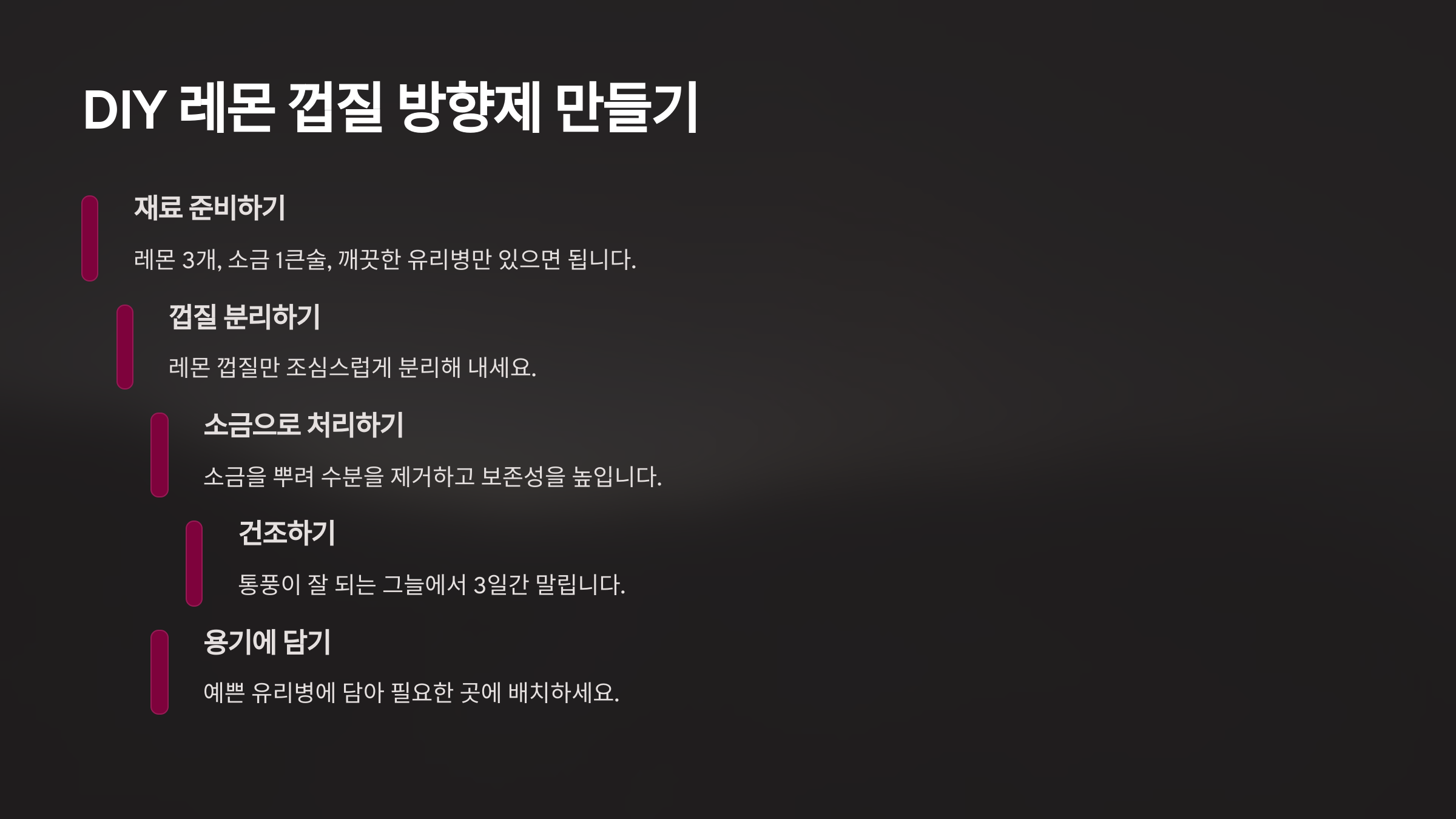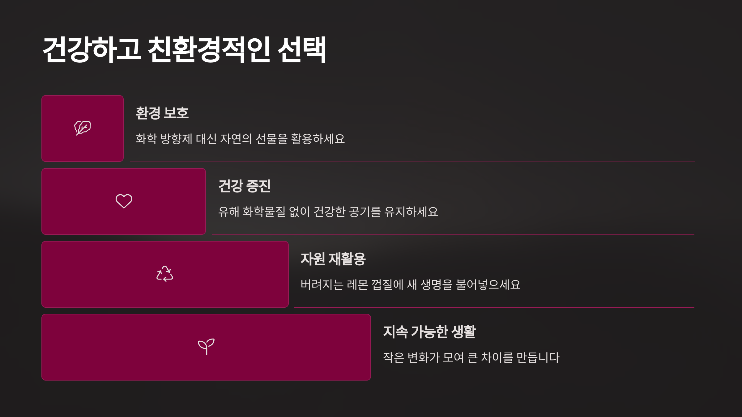 레몬 껍질은 자연 그대로의 향기를 담고 있어서 방향제로 활용하면 정말 좋아요. 특히 시트러스 향은 심신을 안정시키는 데에도 효과가 있답니다. 인공향보다 훨씬 부드럽고 상쾌해서 머리 아픈 냄새 없이 공간을 쾌적하게 만들어줘요.