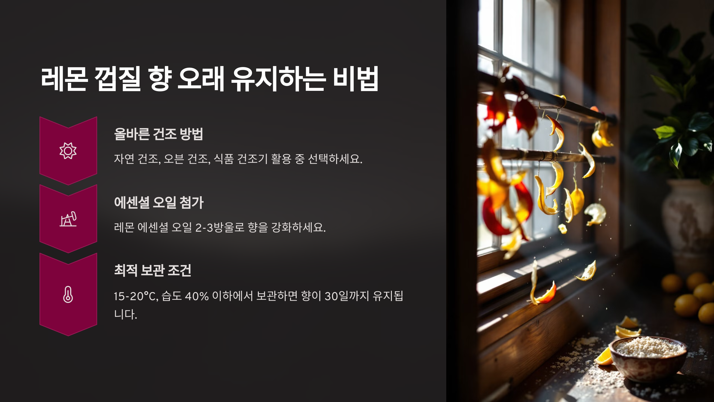 레몬 껍질의 향을 오래 유지하려면 몇 가지 팁이 있어요. 첫 번째는 껍질을 살짝 말리는 거예요. 수분이 많으면 금방 상하지만, 바짝 마른 껍질은 향이 오래가고 곰팡이 걱정도 줄어요.