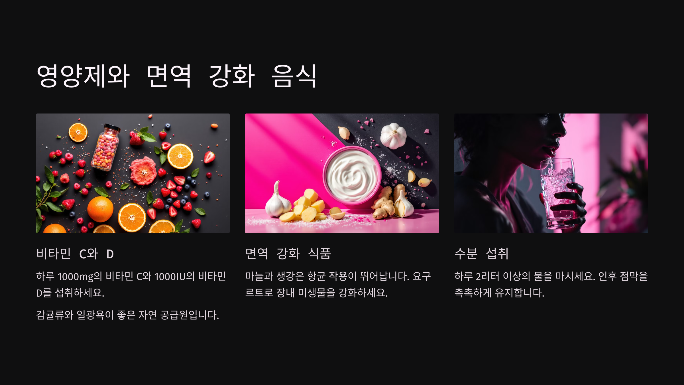 | 영양제 | 비타민D, 아연, 유산균 | 면역세포 활성화, 장 건강 유지 |