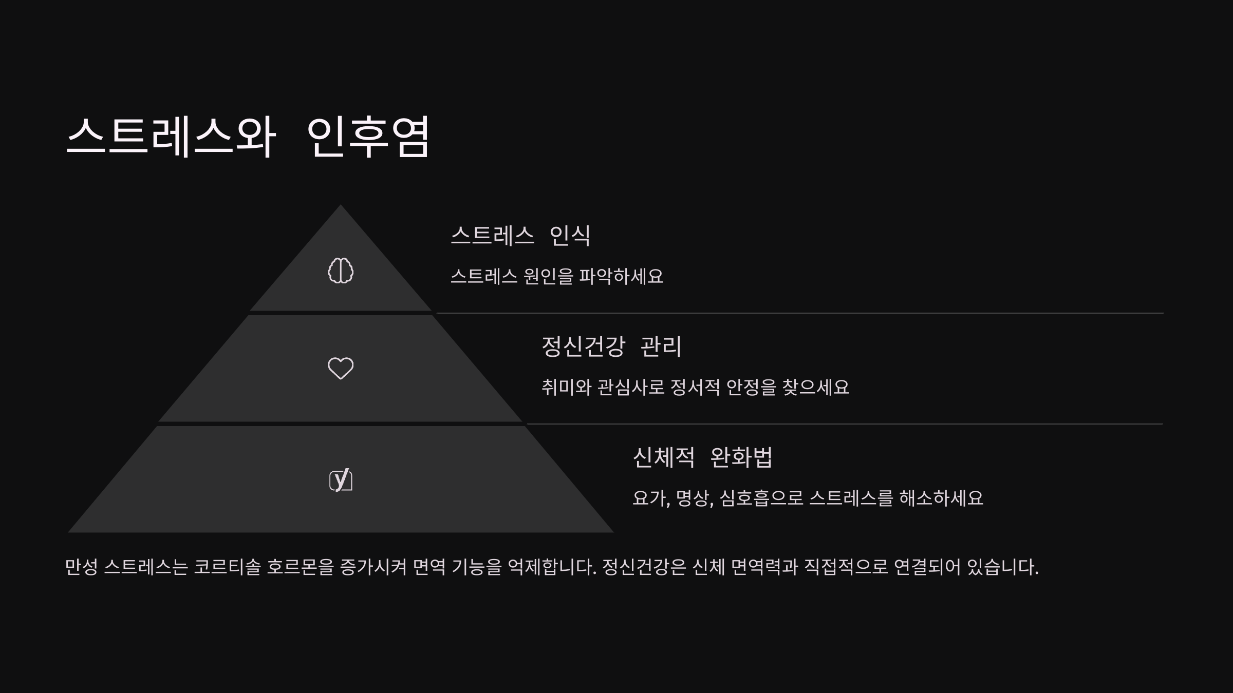 스트레스 관리도 결국 면역 관리예요. 감정도 건강의 한 부분이라는 걸 잊지 말고, 하루에 10분이라도 자신을 위한 시간을 꼭 만들어보세요. 😉
