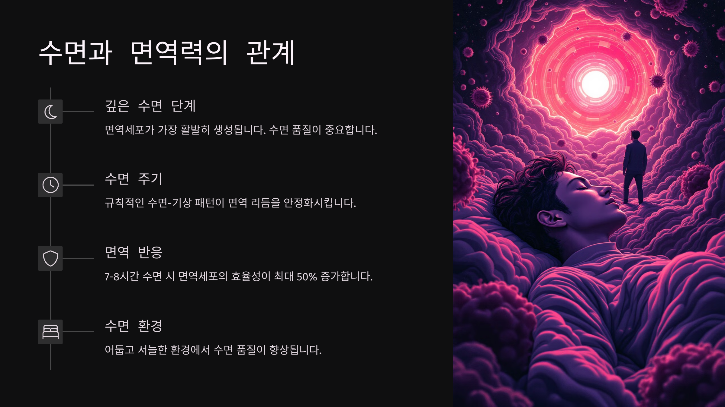 수면 시간도 중요하지만 ‘수면의 질’도 정말 중요해요. 얕은 수면만 반복되면 몸은 충분히 회복하지 못하거든요. 이를 방지하려면 잠들기 1시간 전 스마트폰을 멀리하고, 어두운 조명을 켜두는 게 좋아요. 또 규칙적인 취침 시간은 수면 리듬을 안정시켜줘요. 매일 같은 시간에 자고 일어나는 것만으로도 면역이 튼튼해진답니다. ⏰