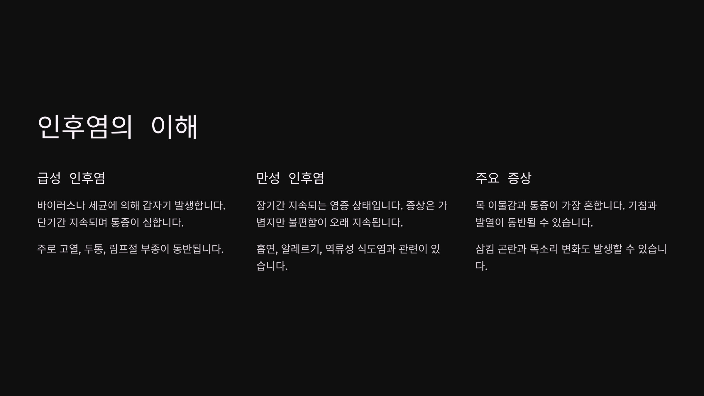 | 잦은 인후염 | 목통증이 빈번하게 발생 |