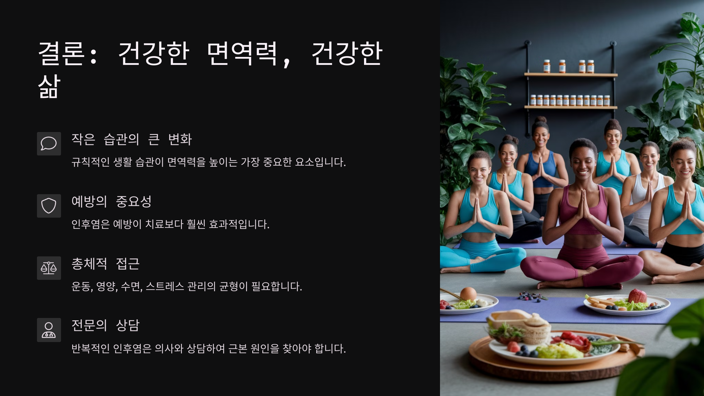 이런 작은 습관들이 모이면, 인후염은 물론 감기나 독감도 잘 안 걸리는 건강한 몸이 만들어져요. 이제 어떤 음식을 먹어야 면역력이 쑥쑥 올라가는지도 함께 볼게요! 🍽️