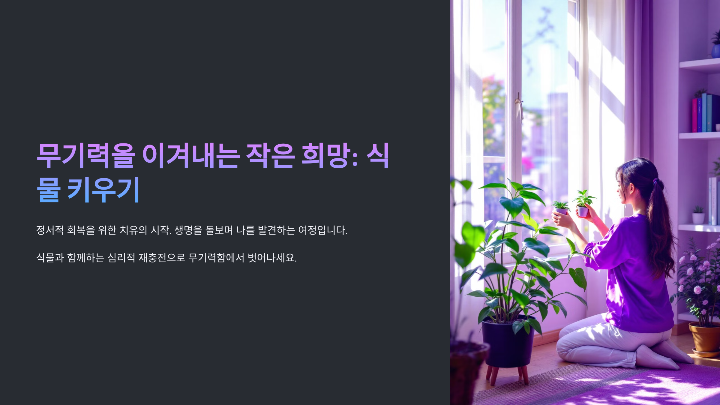 변화는 큰 것이 아니라, 식물 한 화분처럼 작고도 꾸준한 행동에서 시작돼요. 무기력의 반대말은 활력이고, 그 활력은 초록빛에서 시작될 수 있어요. 지금 당장 식물을 데려올 이유는 충분하니까요 🌿🌱