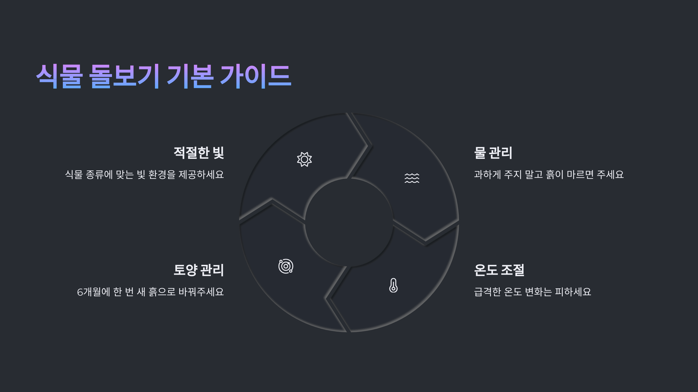 살다 보면 나보다 타인을 먼저 챙기게 되는 순간이 많아요. 하지만 나 자신을 돌보는 일은 절대 뒷전이 되어선 안 돼요. 식물 키우기는 그런 의미에서 ‘나를 위한 루틴’을 만드는 좋은 시작점이에요. 누군가를 돌보듯, 식물을 돌보는 마음이 결국 나에게로 향하거든요.