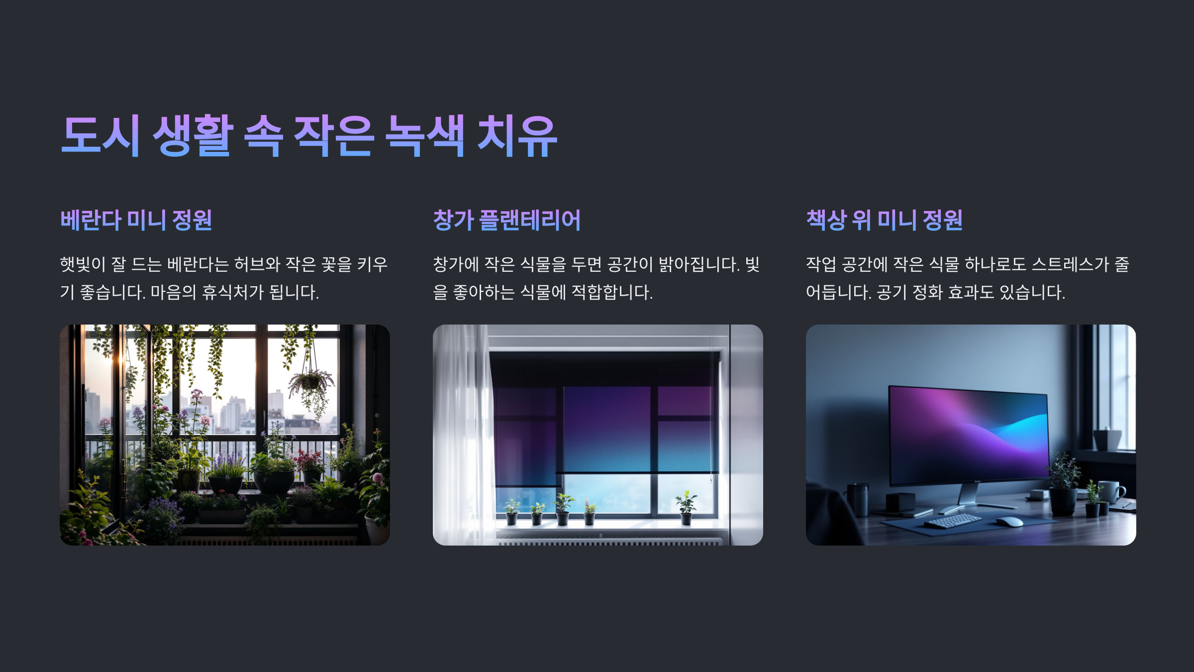 | 책상 위 | 페페로미아, 다육이 | 집중력 향상, 정서 안정 |
