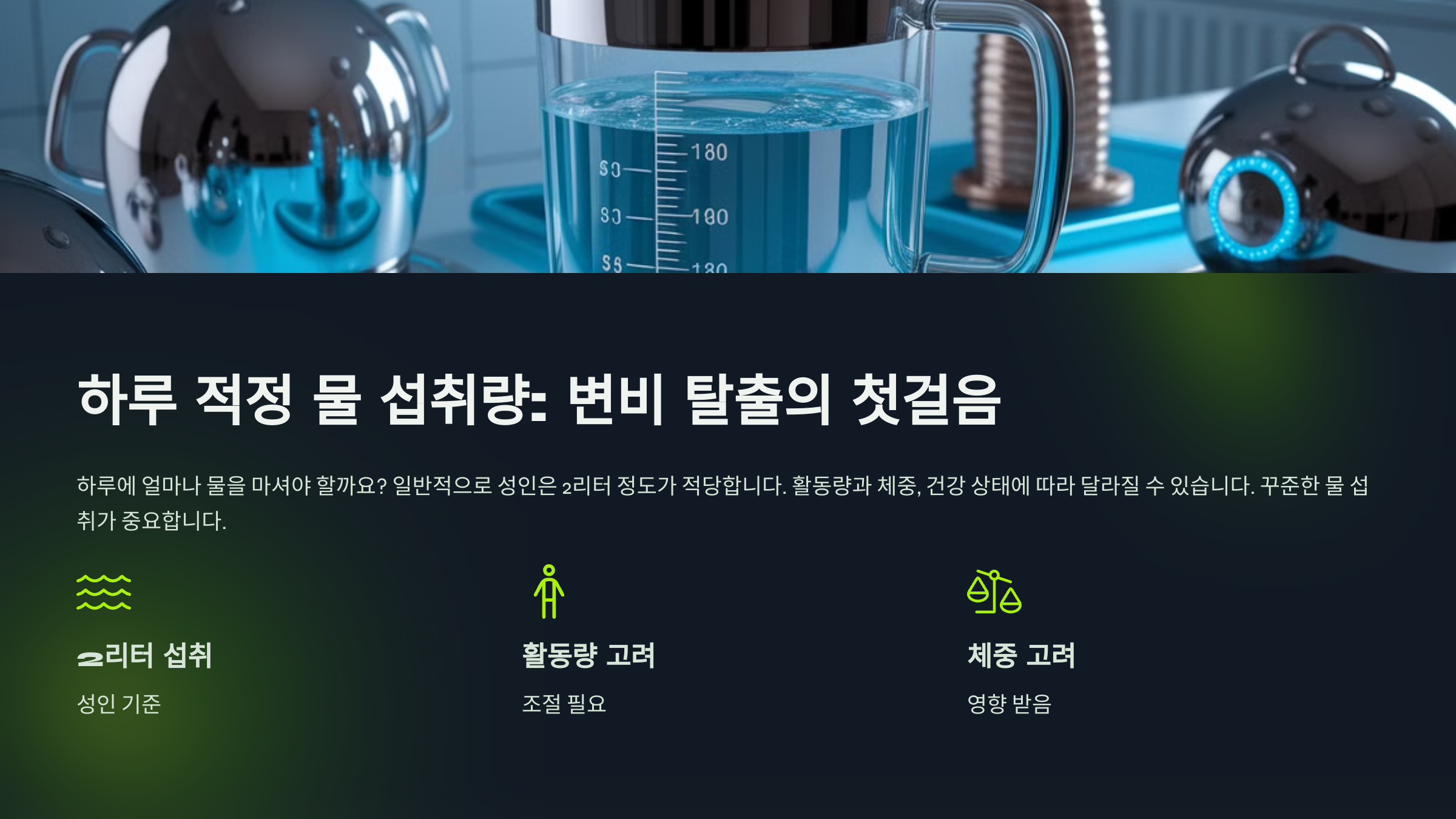 | 운동 전후 | 500ml 이상 | 수분 균형 유지, 노폐물 배출 |
