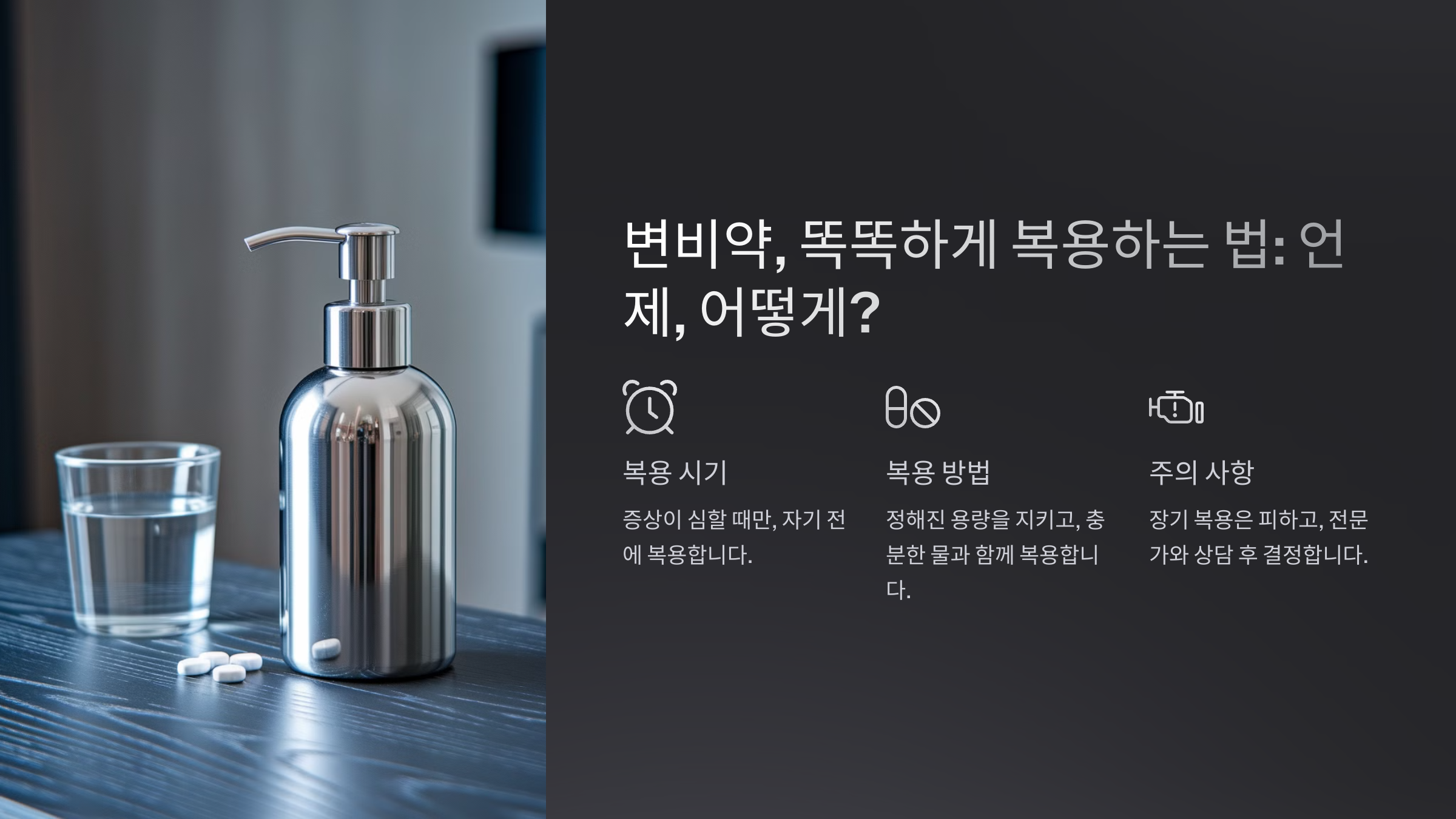💡 변비 약을 복용할 때는 **일시적인 도움**으로 생각해야 해요. **장기 복용은 장 건강을 악화**시킬 수 있기 때문이에요!
