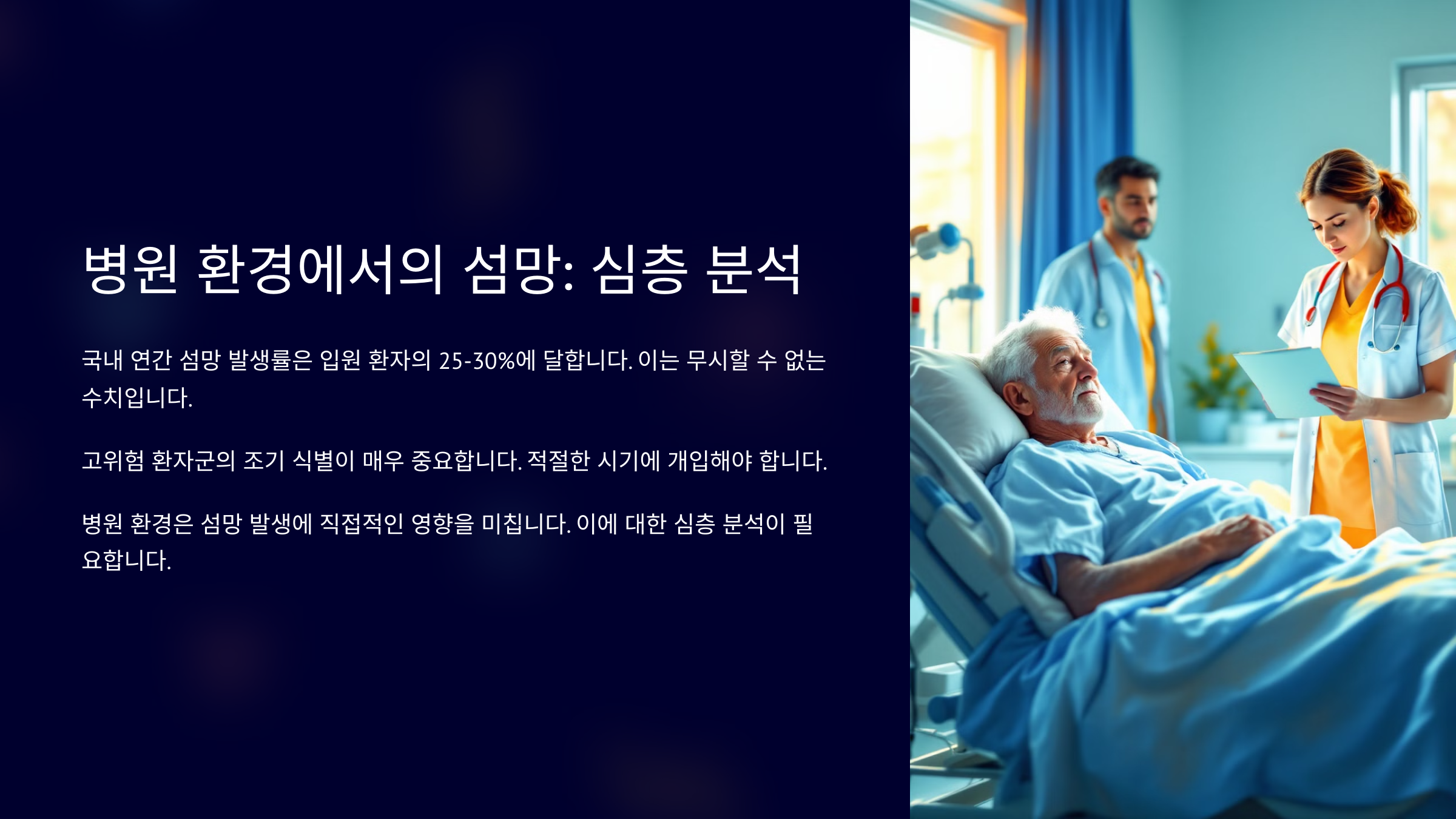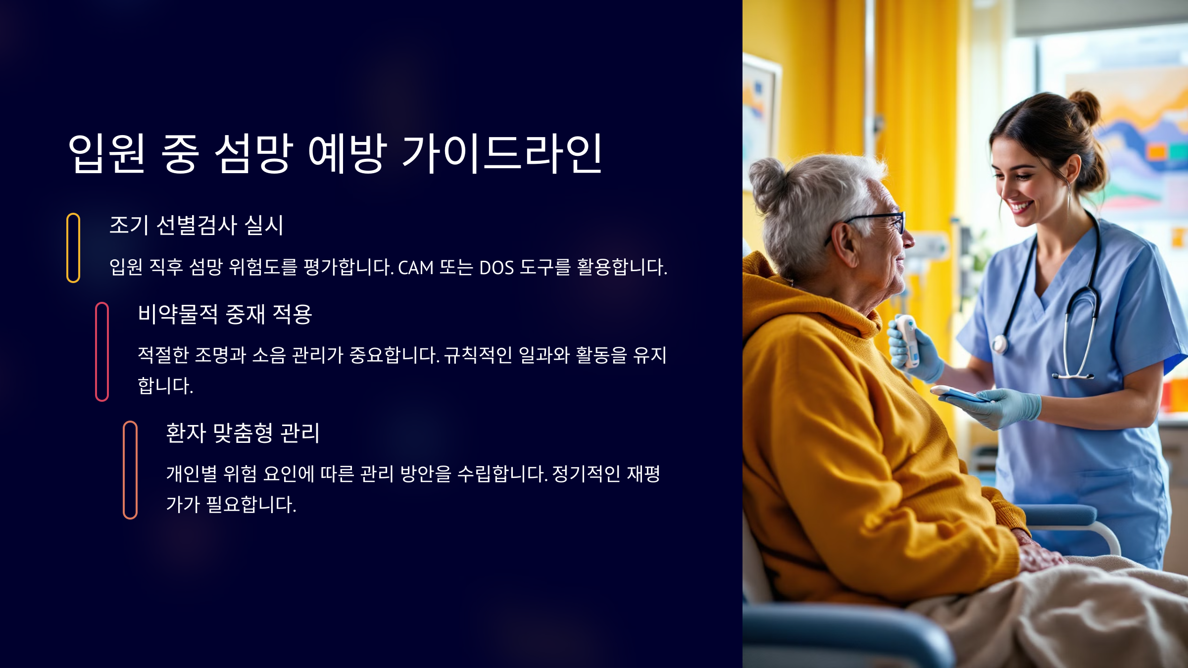 내가 생각했을 때 병원에 입원한 환자들의 회복을 돕기 위해서는 단순한 치료뿐만 아니라 섬망을 예방하고 관리하는 환경적 요인이 정말 중요하다고 느껴져요. 조명, 소음, 간호 인력, 돌봄 체계, 모니터링 등 다방면의 요소가 복합적으로 작용하기 때문에 병원 운영 전반의 점검이 필요하답니다.
