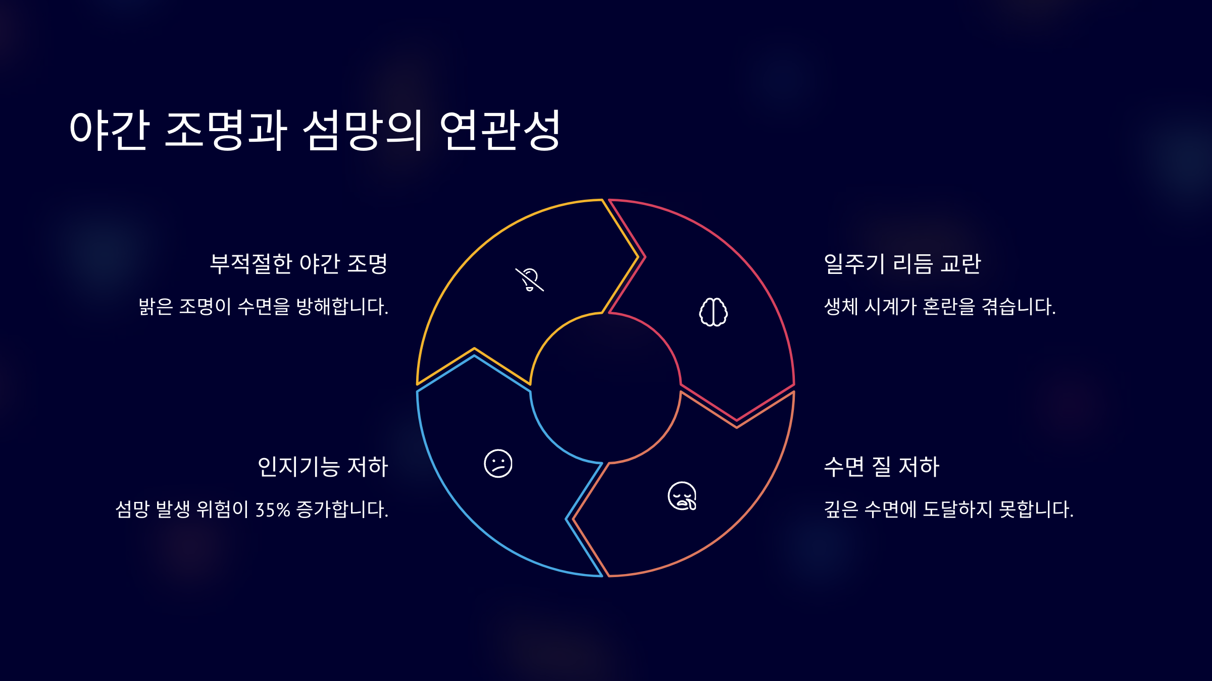 특히 고령 환자의 경우, 멜라토닌 분비가 줄어들면서 빛에 더 민감해지는데요. 밤에 조명이 밝으면 뇌는 아직 낮이라고 인식하고 수면 호르몬 분비를 억제하게 되죠. 이로 인해 잠에 들지 못하거나 자주 깨게 되고, 이는 인지 기능 저하로 이어질 수 있어요.