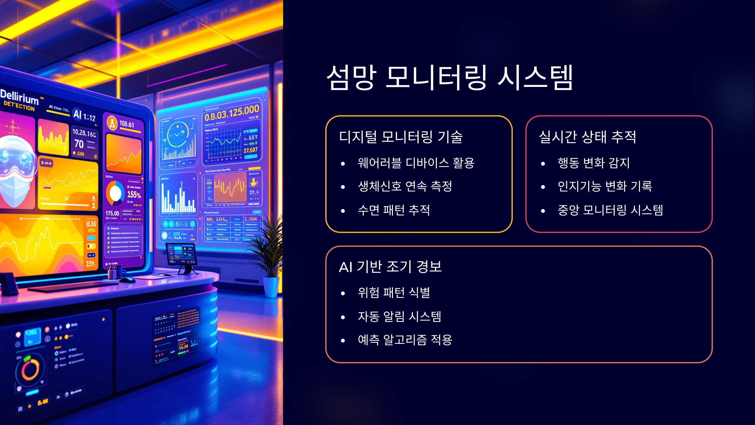 다음 섹션에서는 섬망 조기 발견과 대응을 돕는 ‘모니터링 시스템’에 대해 알려줄게요!