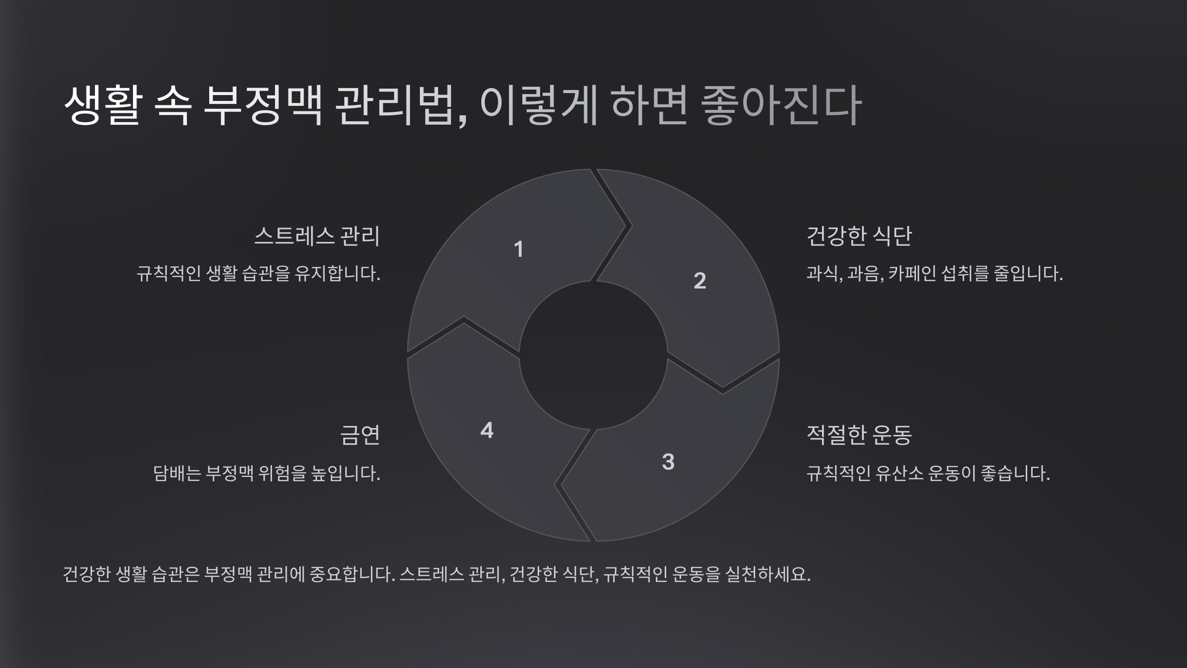 💖 부정맥은 예방이 가능해요! 심장 건강을 유지하려면 꾸준한 관리가 필요하죠. 생활 습관을 개선하고 위험 요소를 줄이면 부정맥 발생 가능성을 낮출 수 있어요.