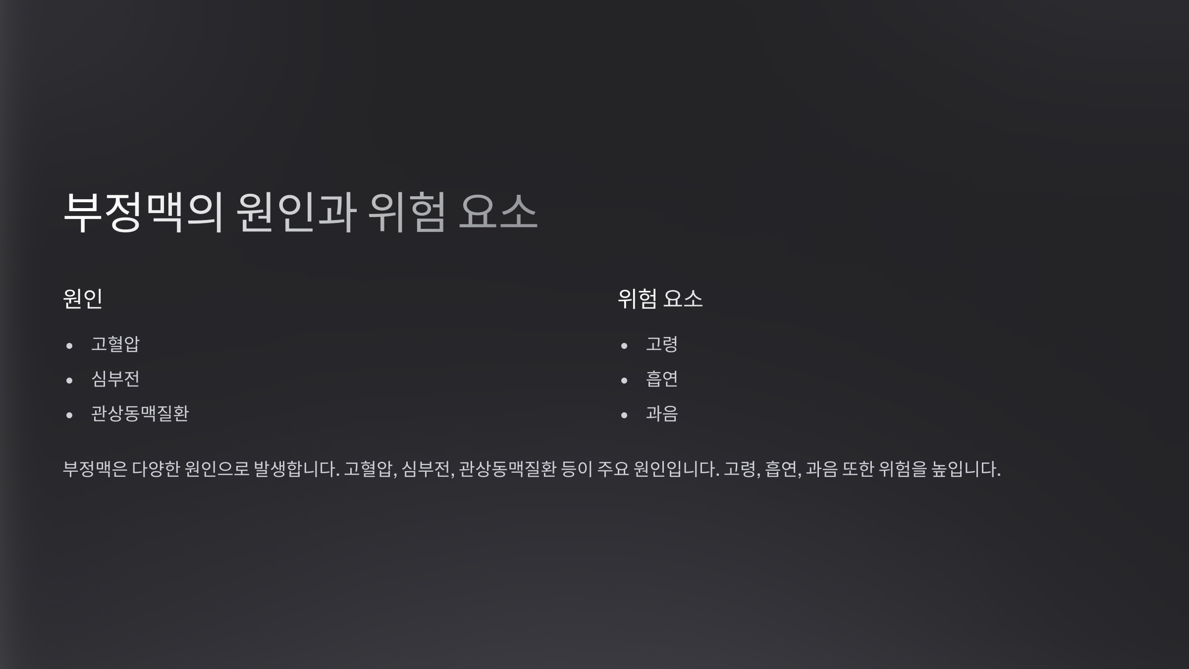 💓 부정맥은 심장의 전기 신호가 정상적으로 전달되지 않을 때 발생하는 질환이에요. 다양한 요인들이 심장 리듬을 흐트러뜨릴 수 있어요. 선천적인 심장 이상, 고혈압, 심장병뿐만 아니라 생활 습관과 스트레스도 중요한 원인이 될 수 있죠.