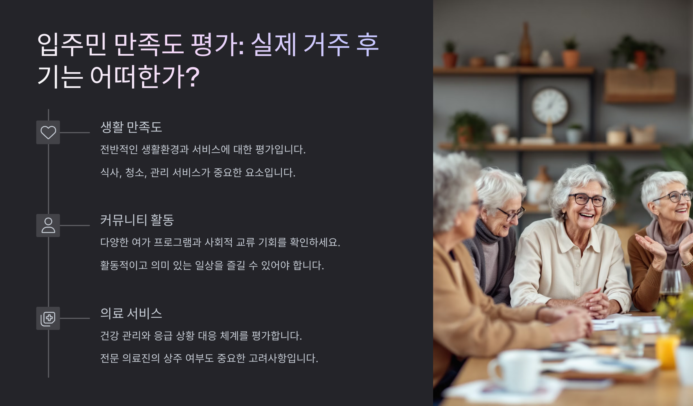 입주민 만족도는 일반적으로 입주 기간, 식사 품질, 프로그램 다양성, 직원 친절도, 청결 상태 등을 기준으로 평가돼요. 이 중에서도 ‘의사소통의 자유로움’과 ‘고립감 해소’가 가장 큰 만족도를 좌우한다고 해요. 노년기에는 정서적 교류가 특히 중요하니까요!