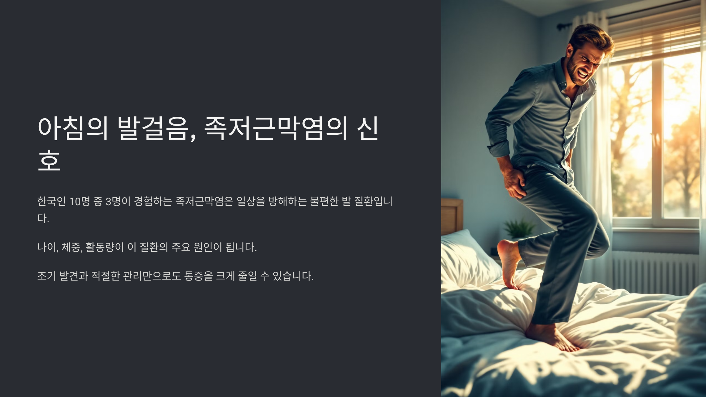 초기 증상은 대개 ‘아침에 일어나서 첫 발을 디딜 때’ 통증이 극심하다는 점이에요. 하지만 몇 걸음 걸은 후에는 통증이 조금 줄어들기 때문에 심각성을 느끼지 못하고 방치하는 경우가 많죠.