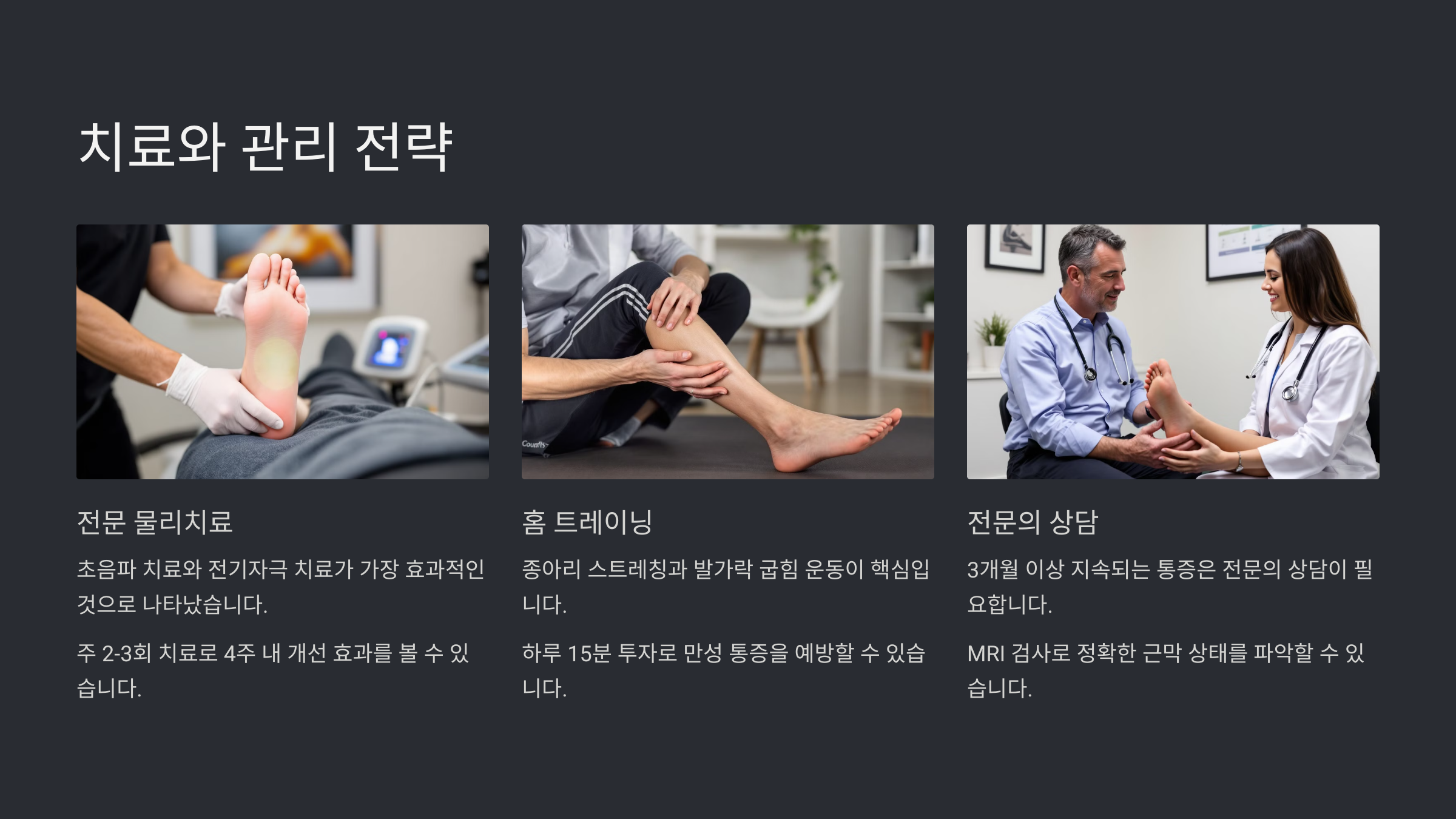 스트레칭 외에도 자기 전 족저근막을 따뜻하게 마사지하거나, 보온 양말을 신는 것도 아침 통증 완화에 효과적이에요. 꾸준한 관리가 포인트예요.